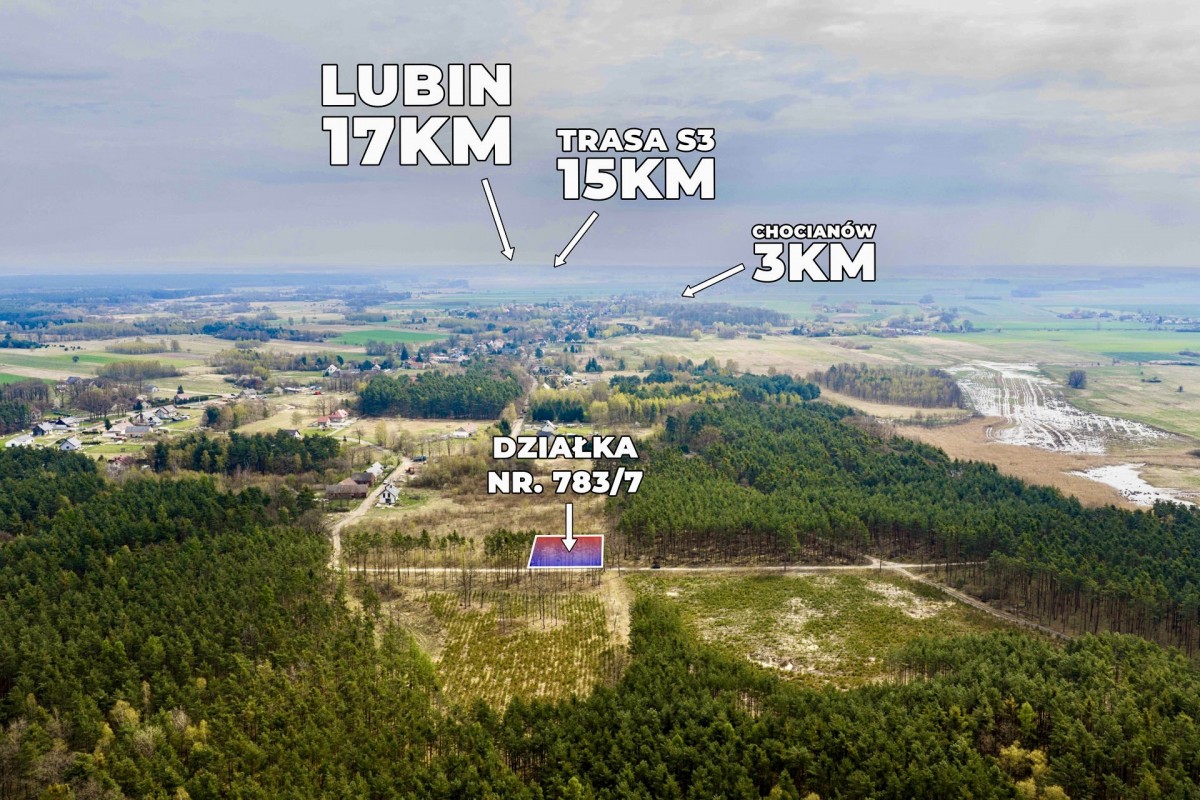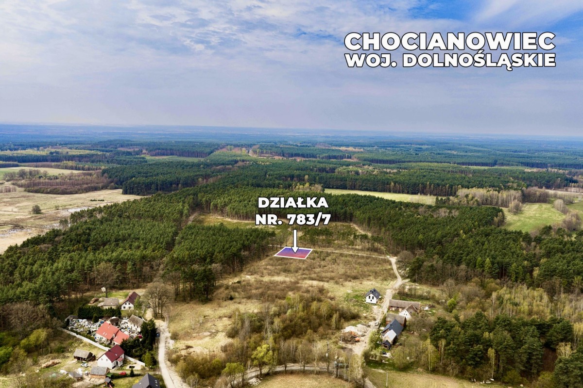 Na sprzedaż działka budowlana otulona lasem, położona w miejscowości Chocianowiec, w województwie dolnośląskim, w powiecie polkowickim, w gminie Chocianów.