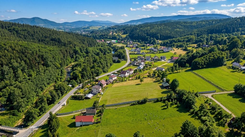 Działka oferuje doskonałą lokalizację w otoczeniu pagórków i lasów.
