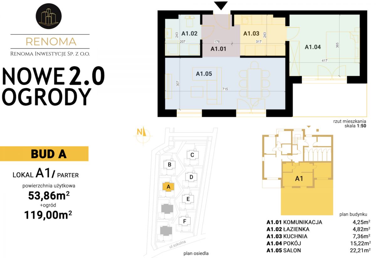 * Parter: Lokale A1 (53,86 m²) oraz A2 (55,89 m²) z imponującymi ogrodami (119 m² i 104 m²) - produkt o najwyższej marży.