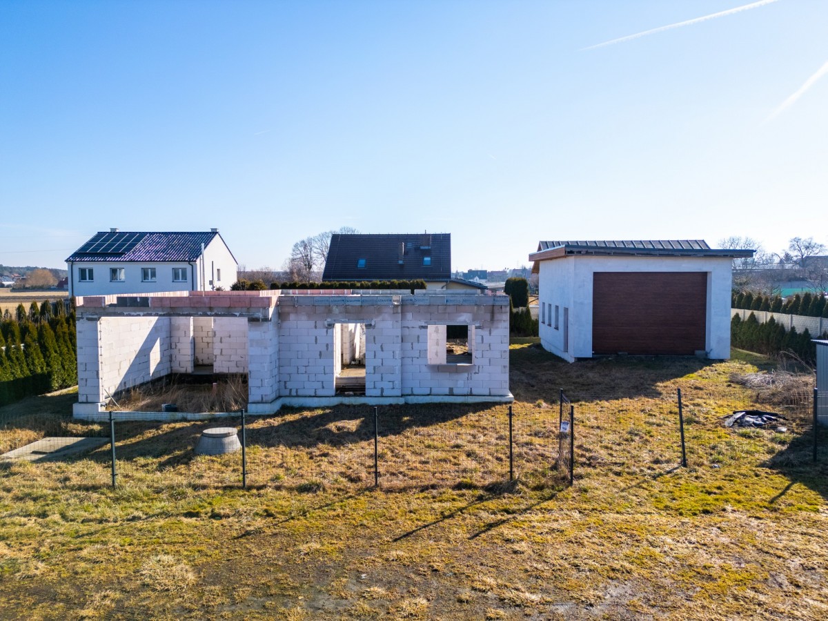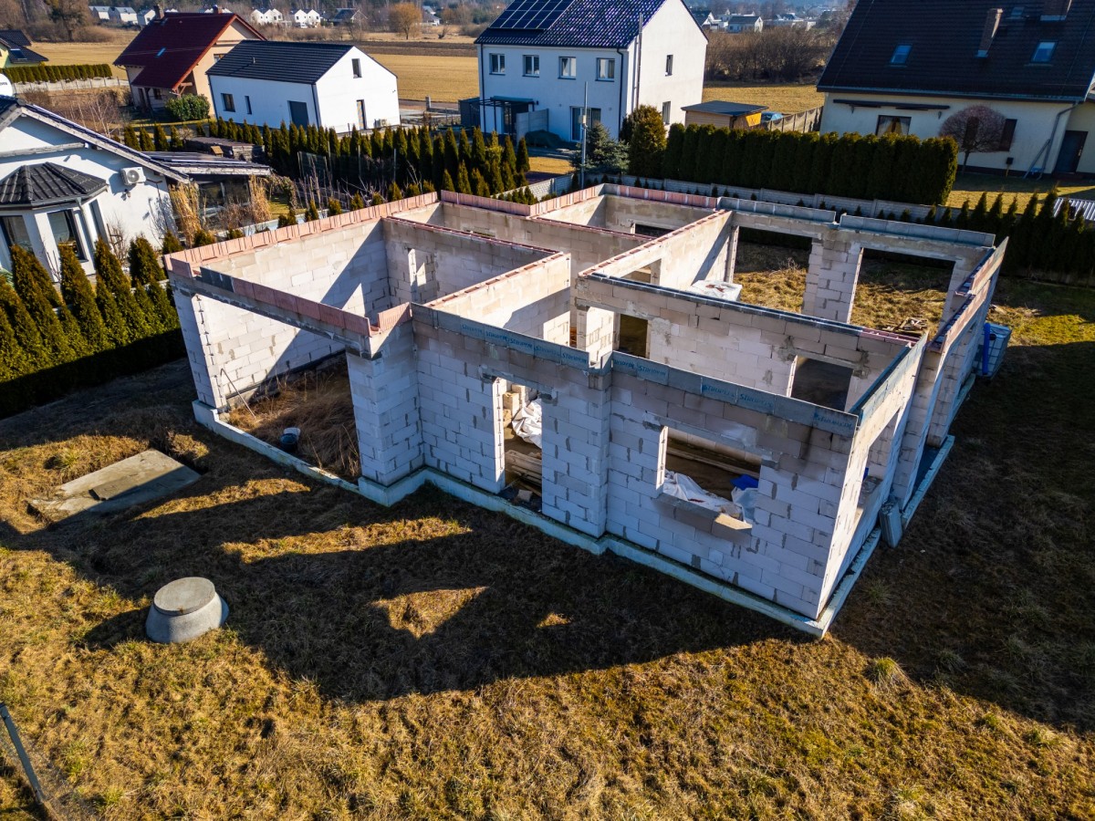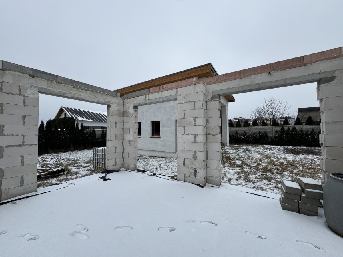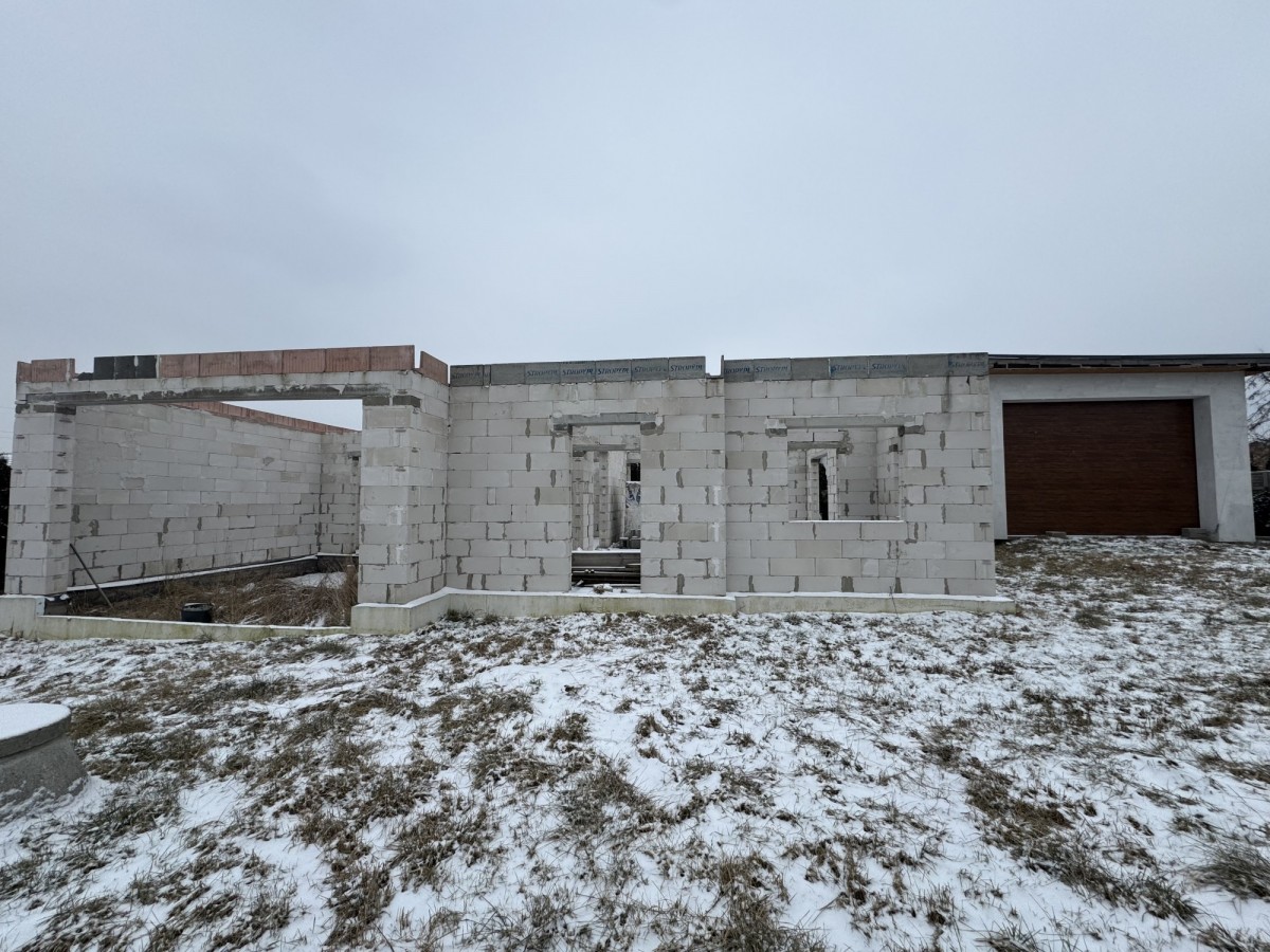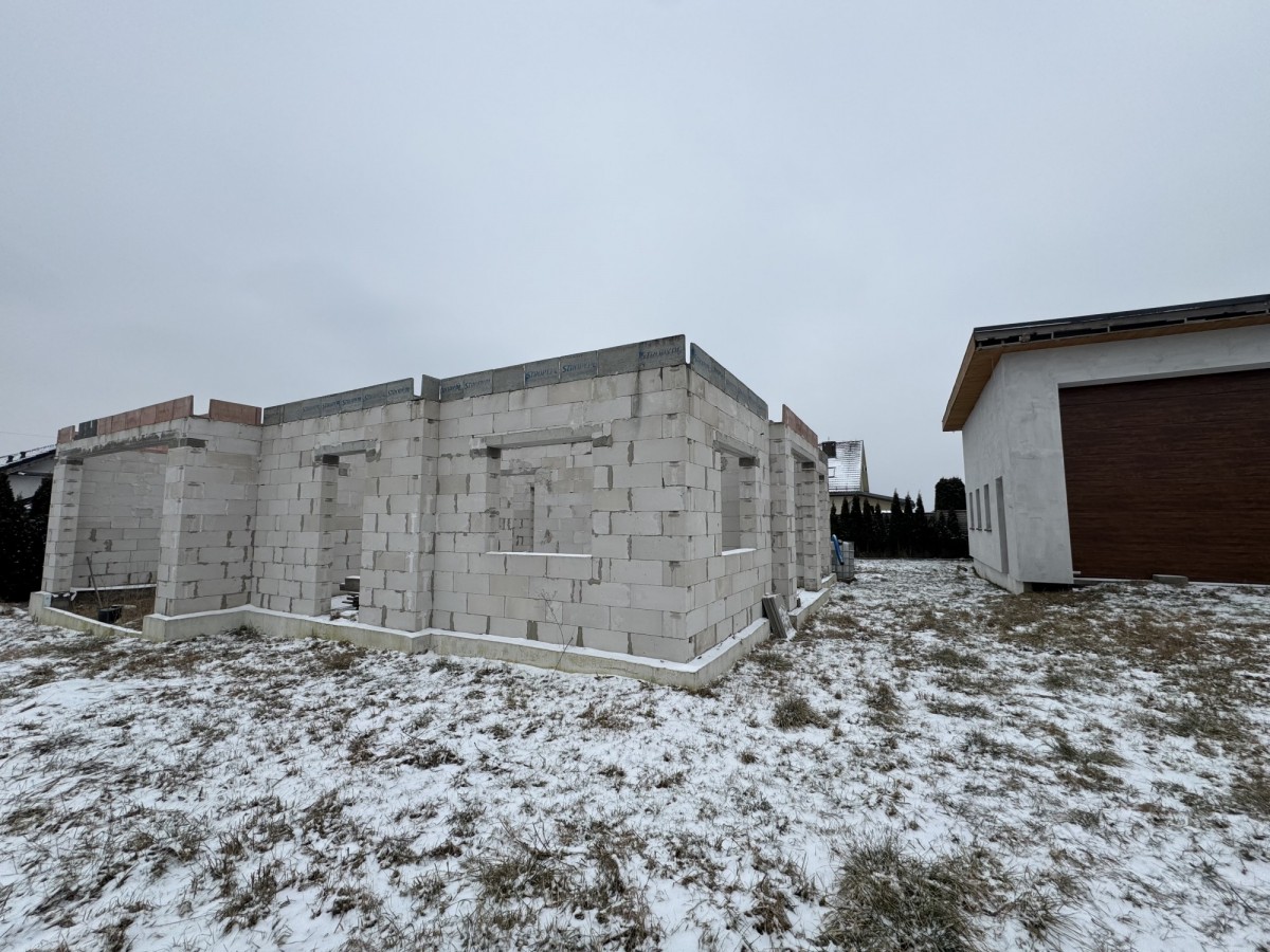 Dom stawiany na płycie betonowej (nie fundamencie). Stan surowy otwarty, bez stropu.