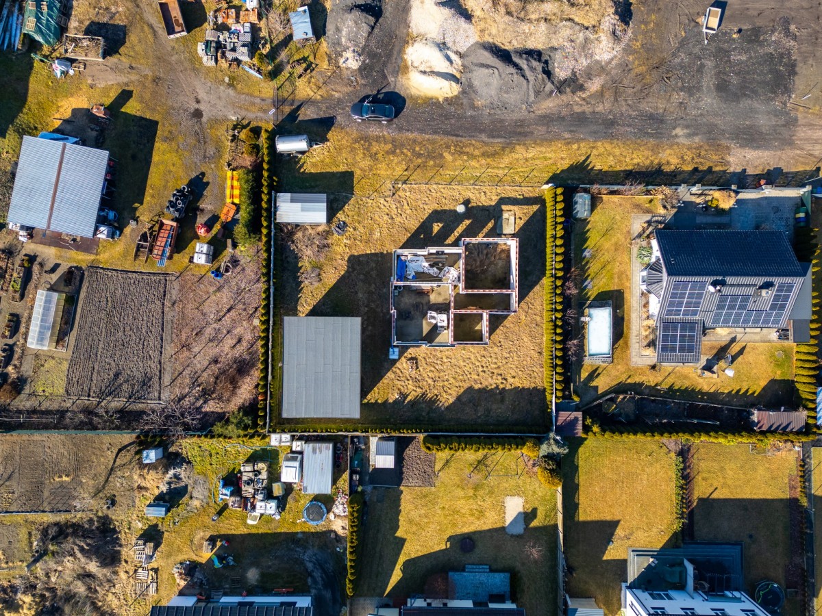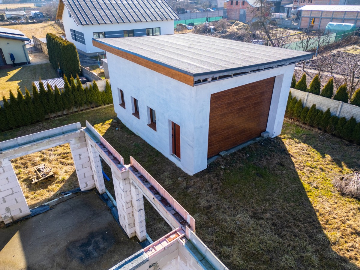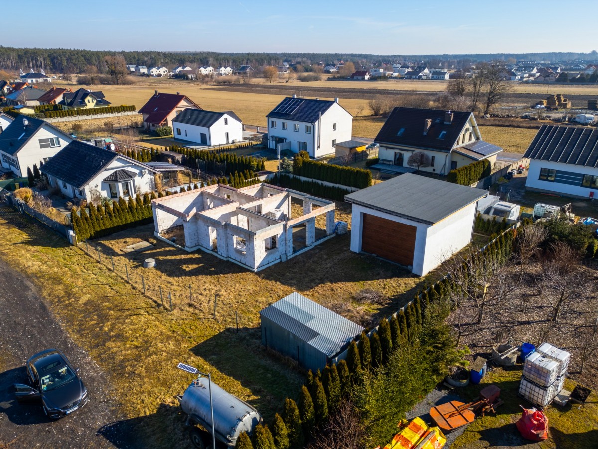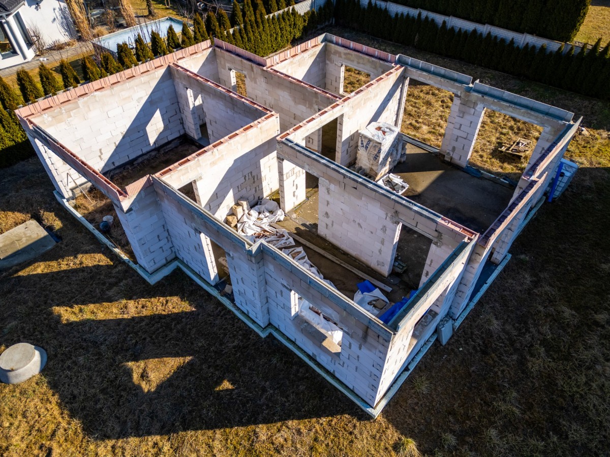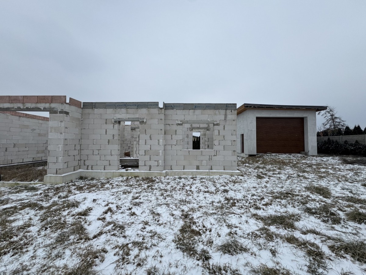 Dom stawiany na płycie betonowej (nie fundamencie). Stan surowy otwarty, bez stropu.
