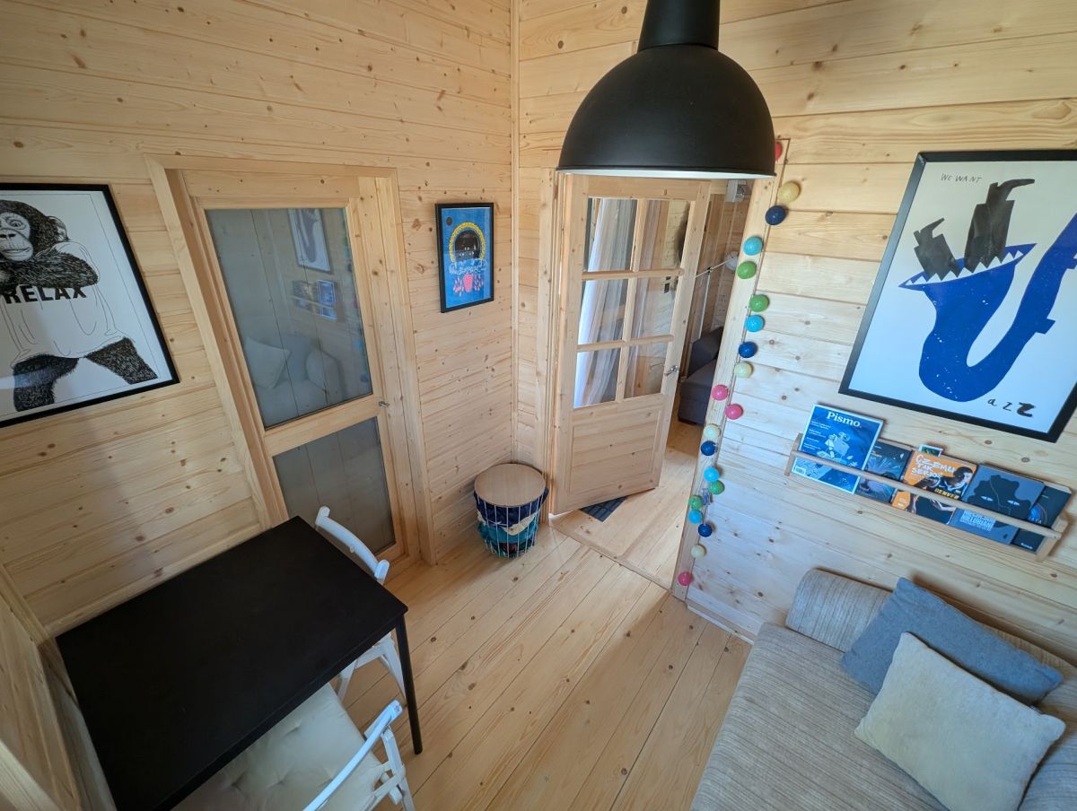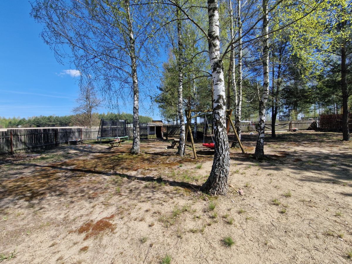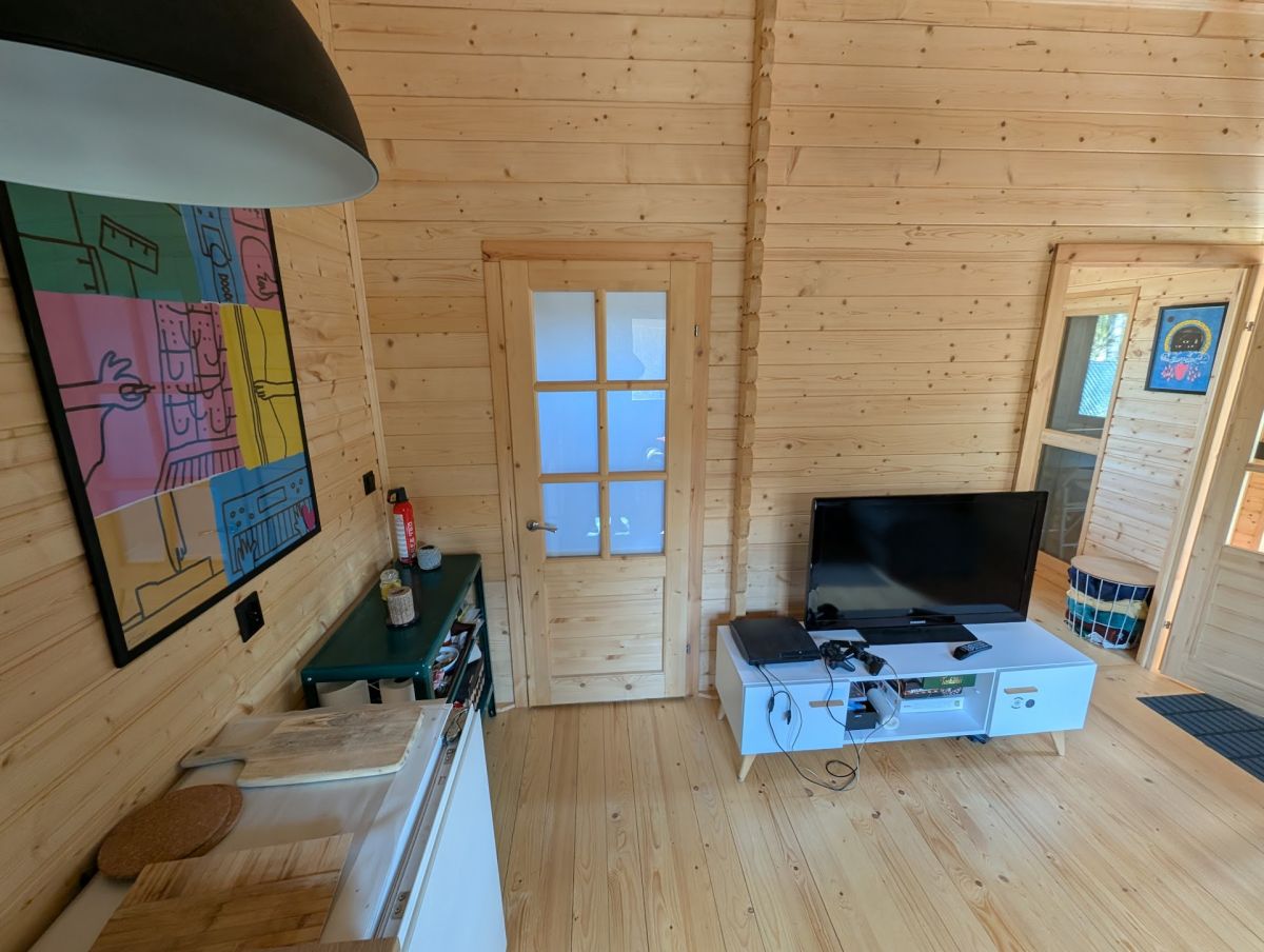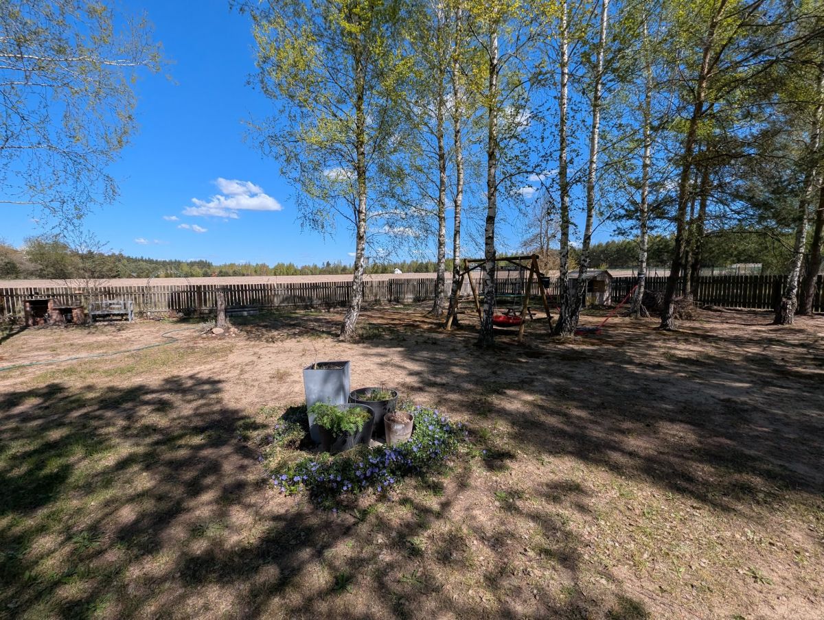 Na działce znajduje się drewniany, ocieplony domek o pow. ok. 30m2 z dużym, częściowo zadaszonym tarasem. Domek podzielony jest na niewielką sypialnię, strefę dzienną - pokój z aneksem kuchennym oraz łazienkę z prysznicem. Domek w pełni wyposażony, uzbrojony w media.