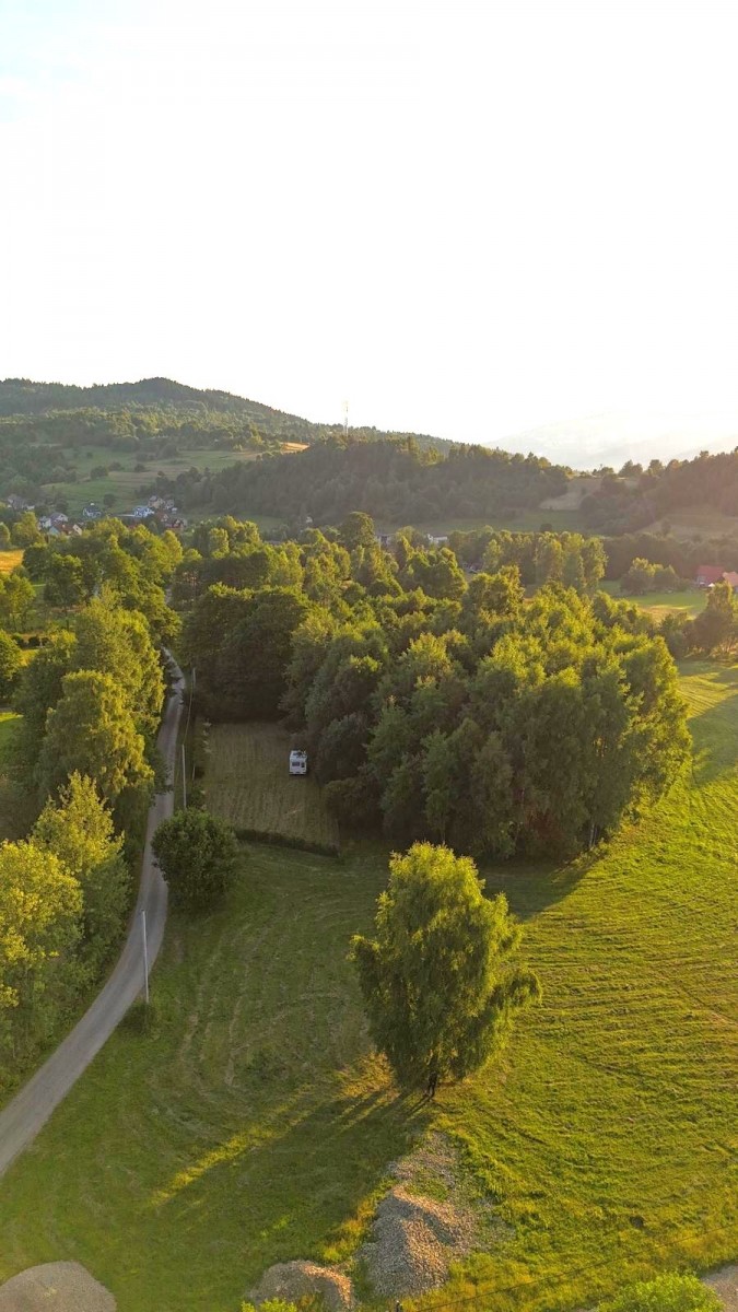 Na działce już stoi przyczepa kempingowa - możesz przyjechać i od razu rozsiąść się z kubkiem kawy patrząc na góry i słuchając szumu drzew.