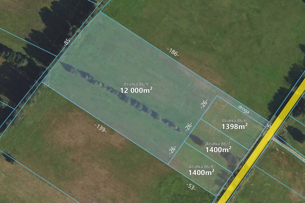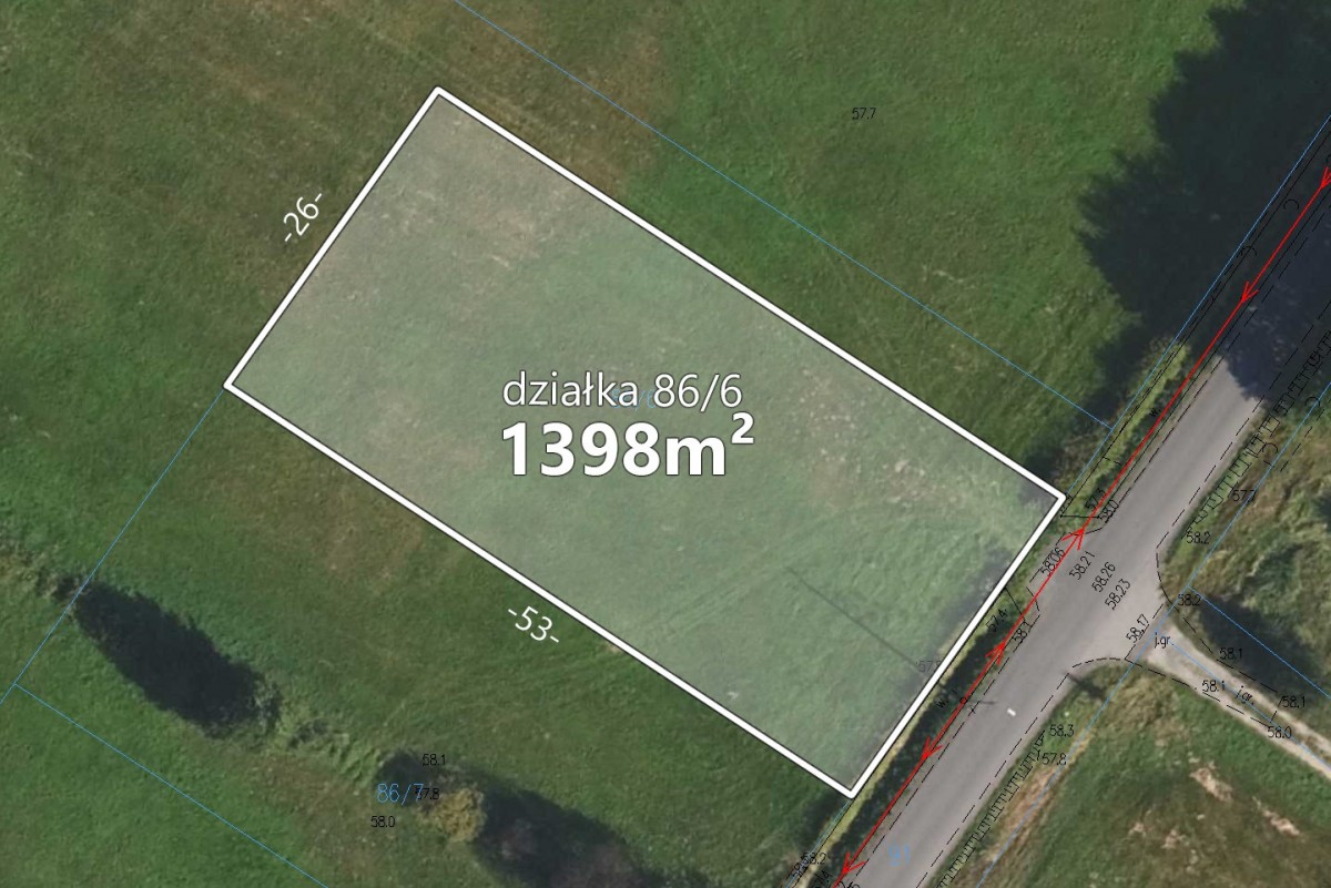 Działka nr ewid. 86/6, o wymiarach ok 26x53m,o statusie budowlanej, z bezpośrednim dostępem do asfaltowej drogi gminnej oraz do sieci elektroenergetycznej, co ułatwia rozpoczęcie inwestycji.
