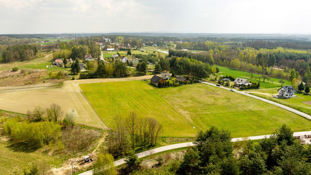 Działki mają regularny kształt, teren jest płaski, a dojazd zapewnia droga gminna asfaltowa.