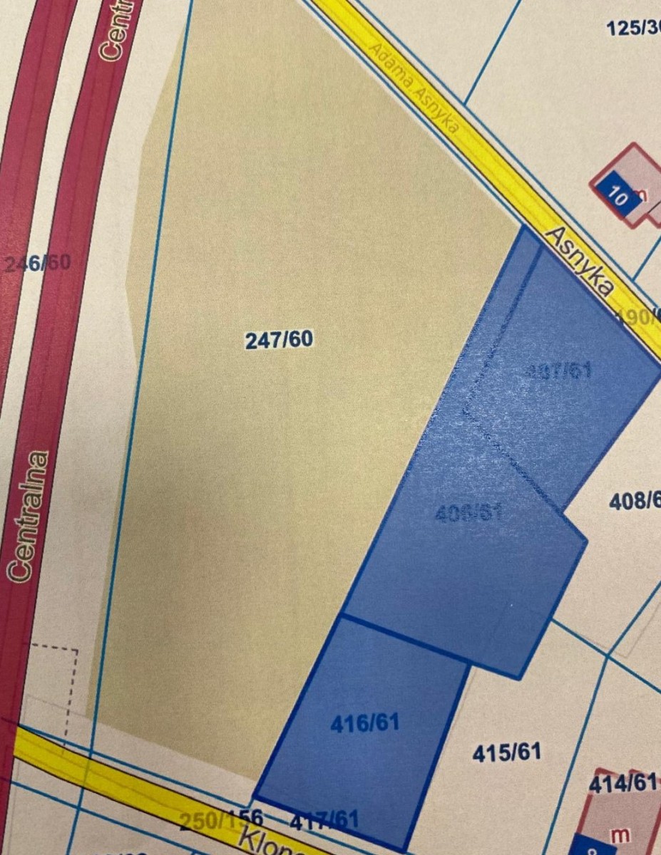 Działka ma kształt nieregularny zbliżony do prostokąta , szerokość działki od strony ul. Asnyka to ok 31m, szerokość działki od ul. Klonowej to ok 21m, długość działki 100m