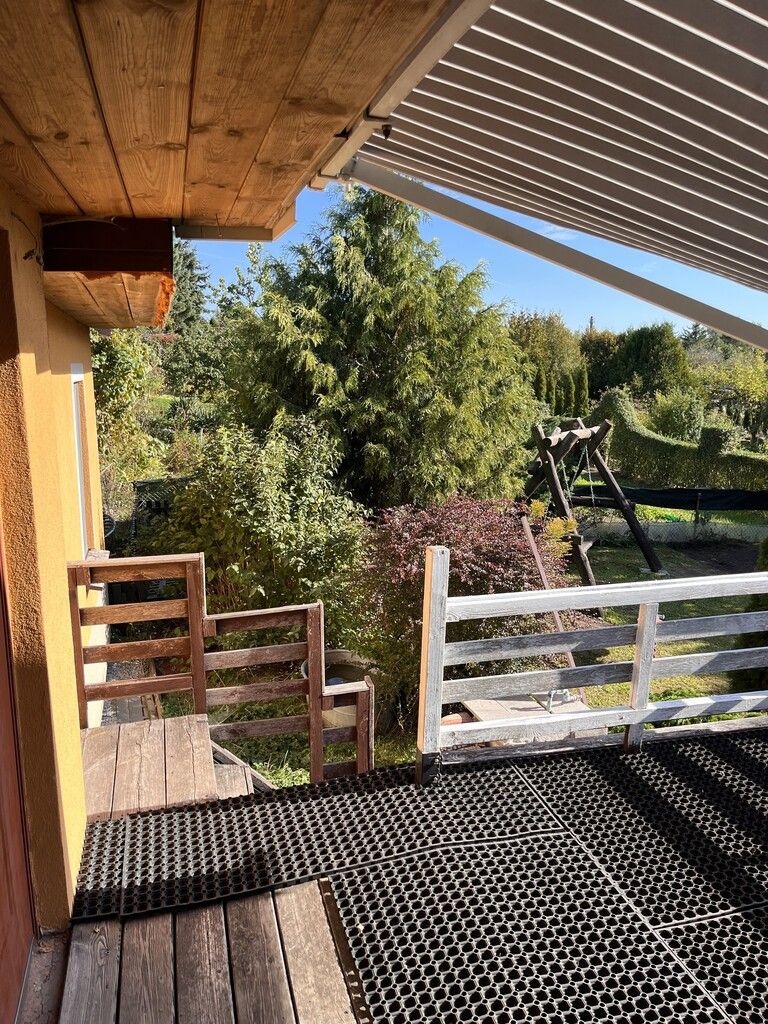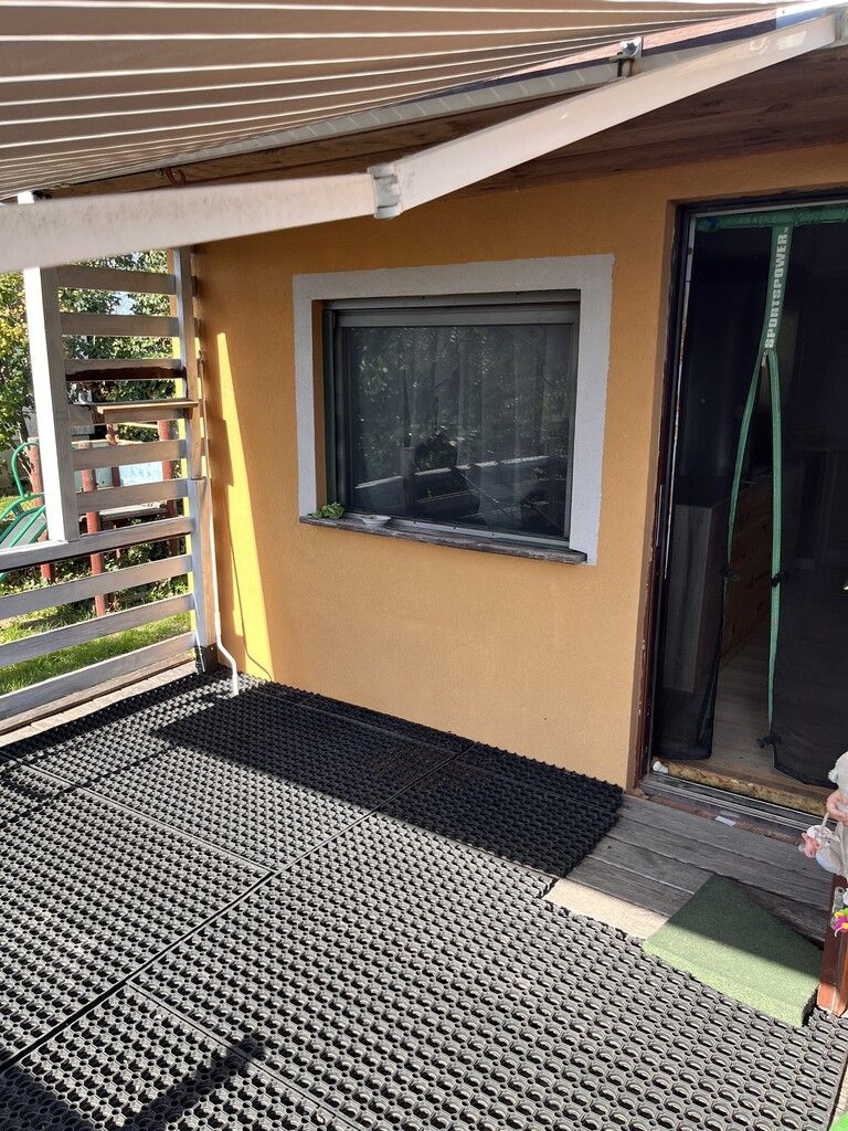- Funkcjonalny taras przed domkiem osłonięty markizą