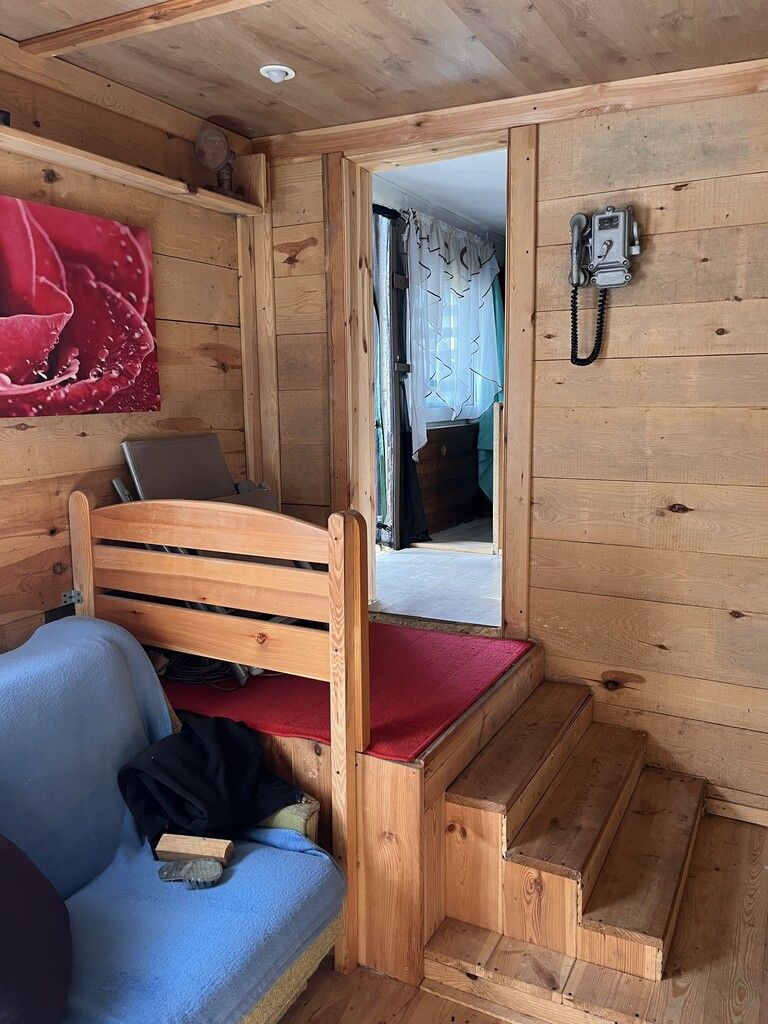 Sercem posesji jest główny domek, który swoim przytulnym charakterem i pomarańczową elewacją od razu przykuwa uwagę. Wnętrze jest dobrze przemyślane, aczkolwiek wymaga odświeżenia.