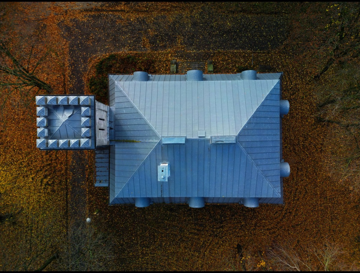 Budynek wykonany z cegły w układzie podłużnym z drewnianą więźbą dachową mansardową.