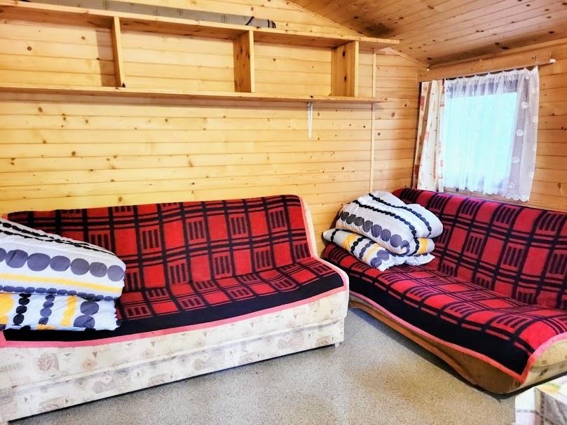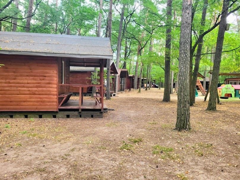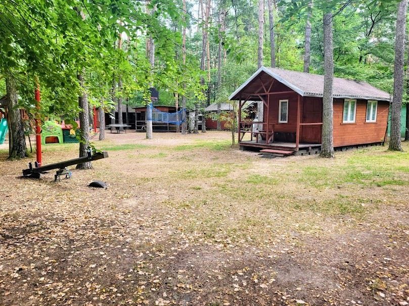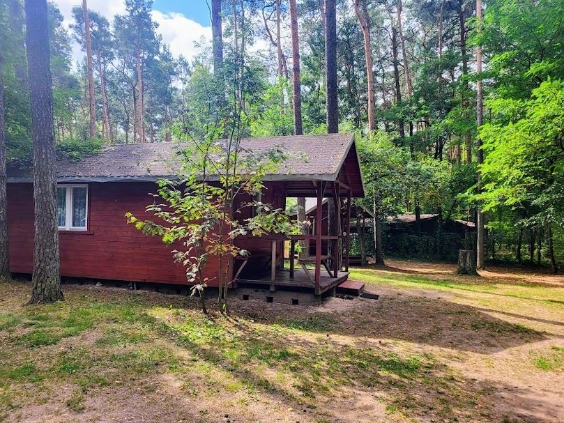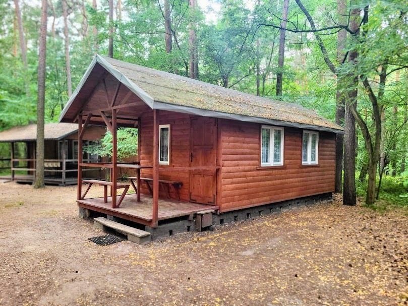 - 12 drewnianych domków letniskowych (w pełni wyposażonych, z mediami: prąd, woda, szambo),