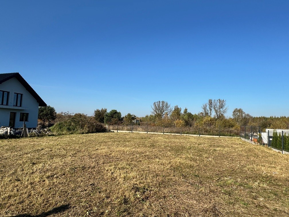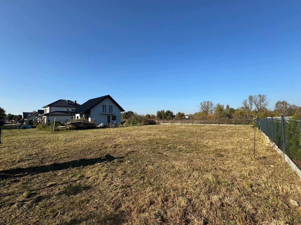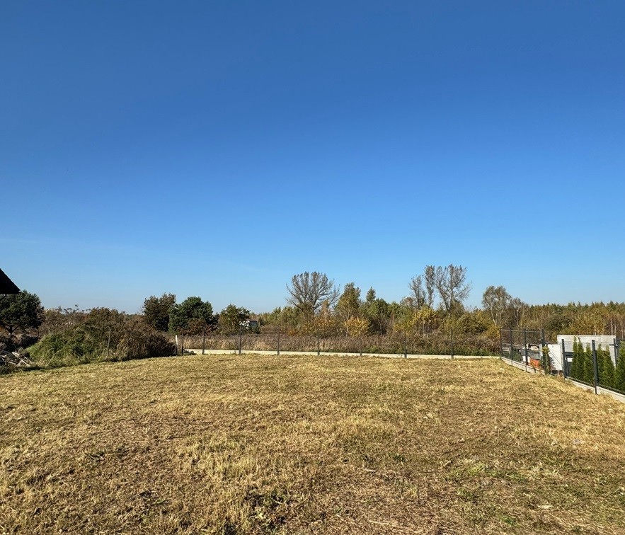 Działka ogrodzona z 3 stron siatką. Media w granicy.