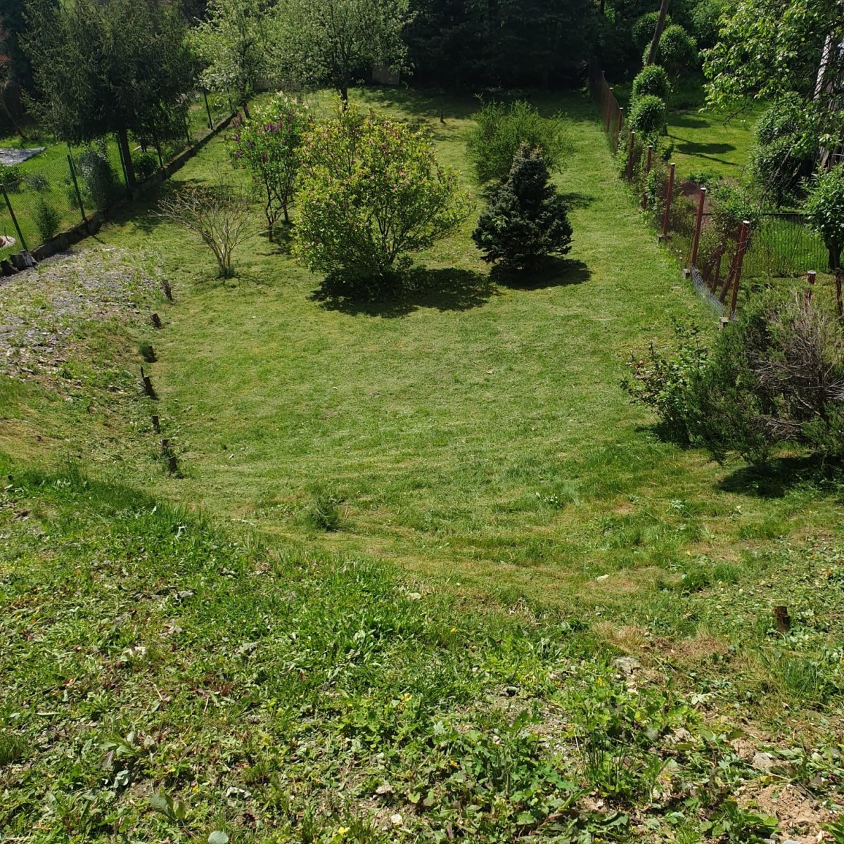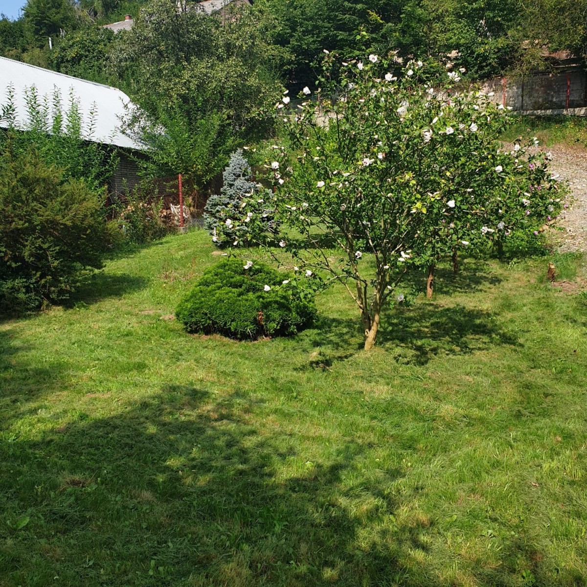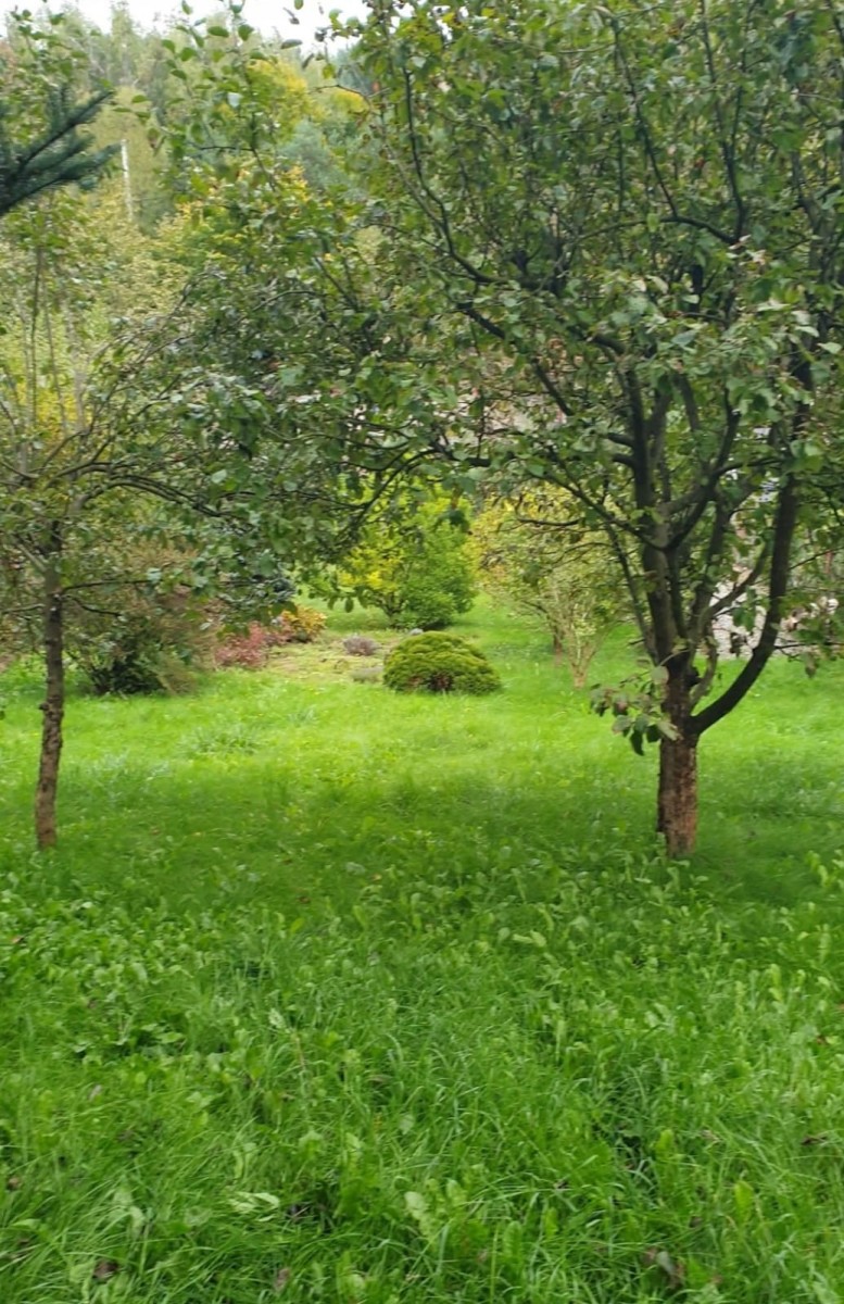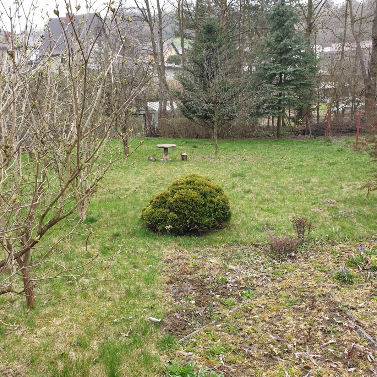 Na działce rośnie jabłoń, magnolia, dwa świerki i krzewy.