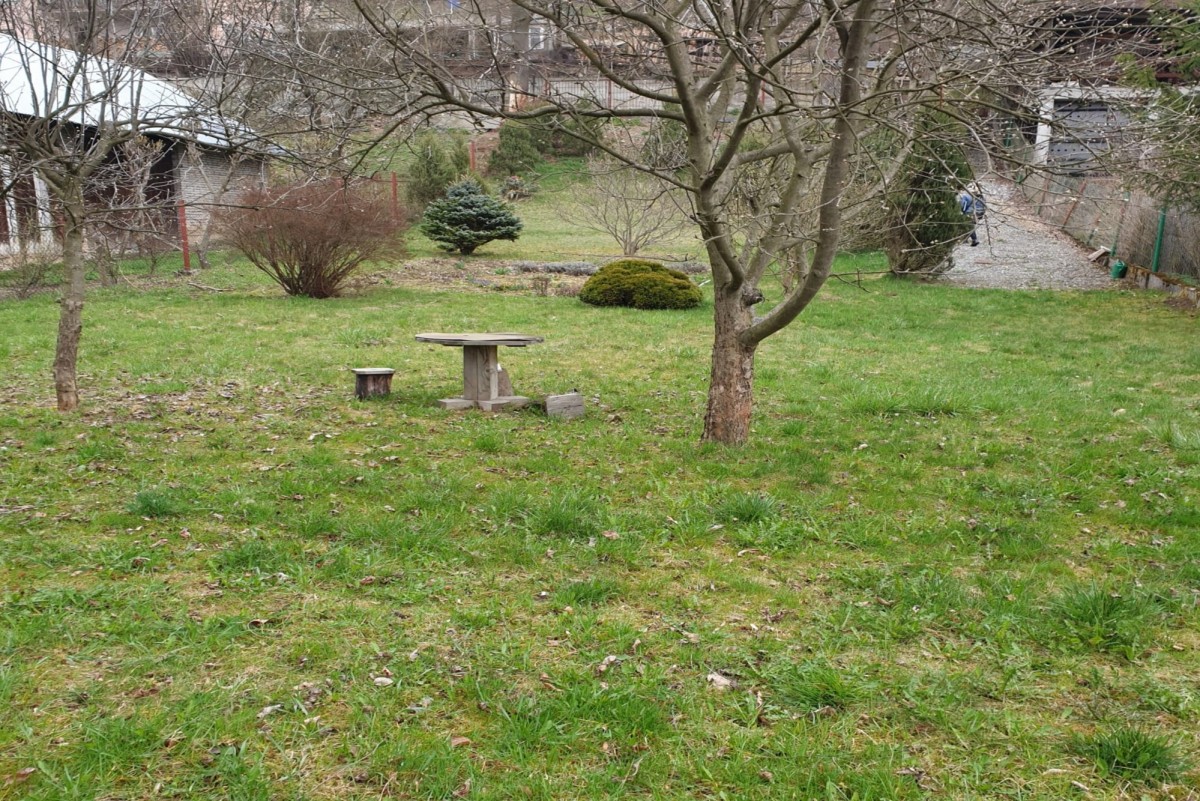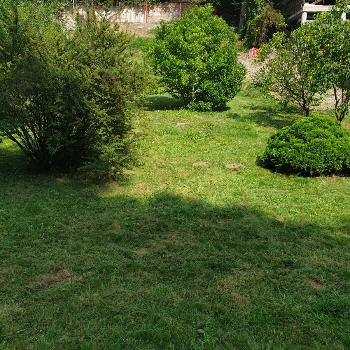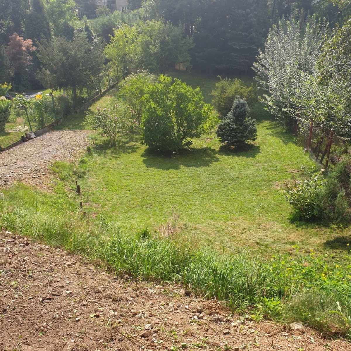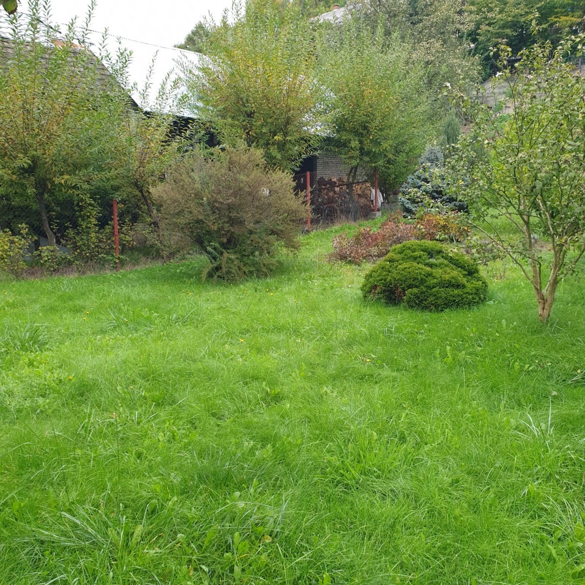 Na działce rośnie jabłoń, magnolia, dwa świerki i krzewy.