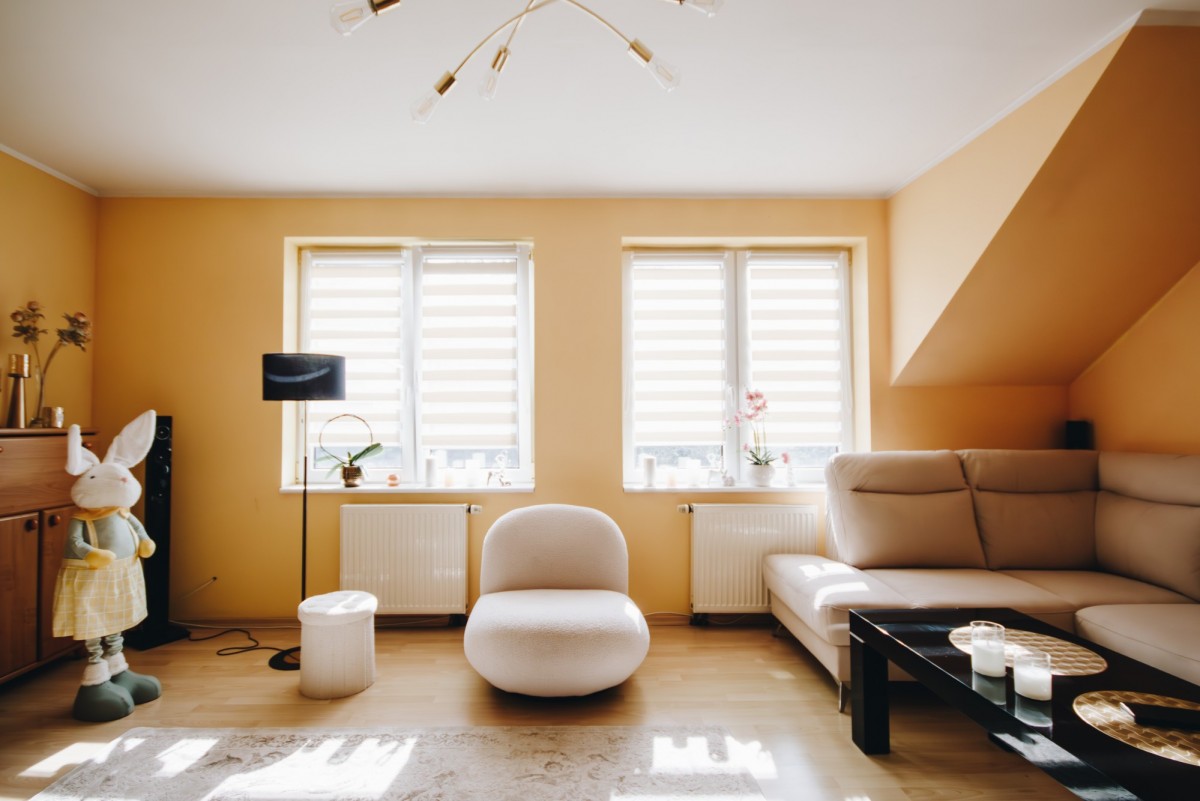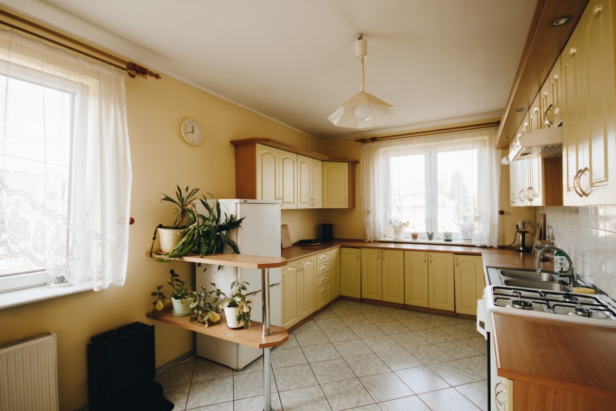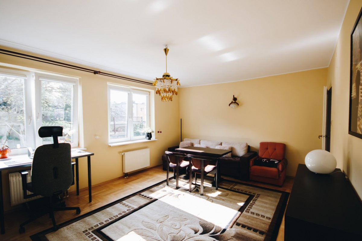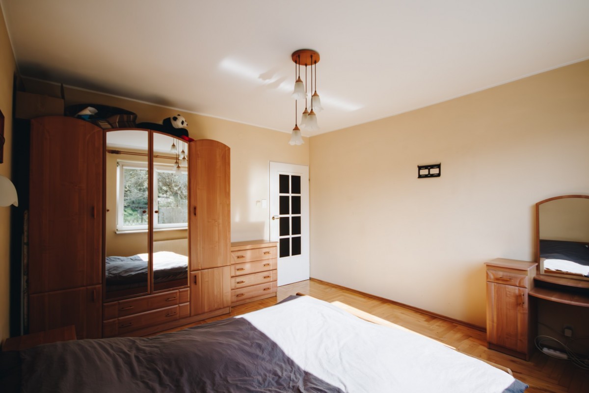 - Parter (ok. 95 m²): niezależne mieszkanie z osobym wejściem, salon, dwie sypialnie, kuchnia, łazienka i ubikacja.