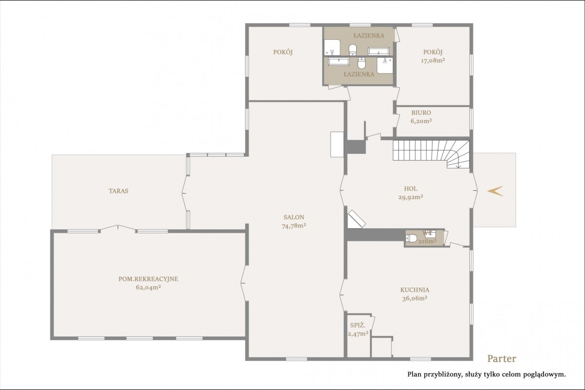 An undeniable asset of this space is the orangery, which in winter serves as a winter garden, while in summer it is the perfect extension of the garden, thanks to which we can admire the beautiful greenery, while at the same time the interior is perfectly illuminated. The floors on the ground floor are tiled with high-quality Italian stoneware.