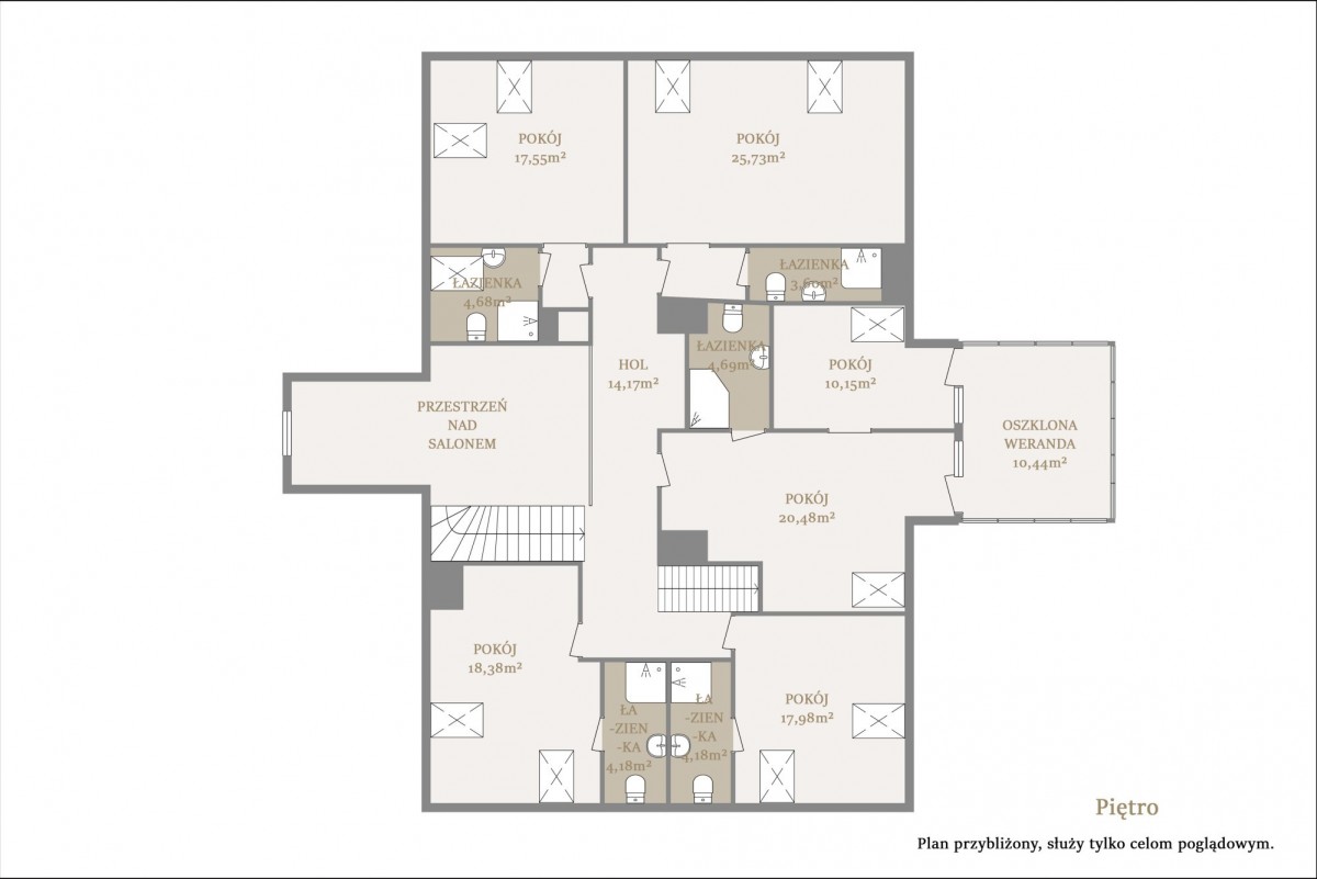 Na piętro prowadzą piękne, stylowe, dębowe schody. Tutaj znajdują się pokoje gościnne każdy z własną łazienką: