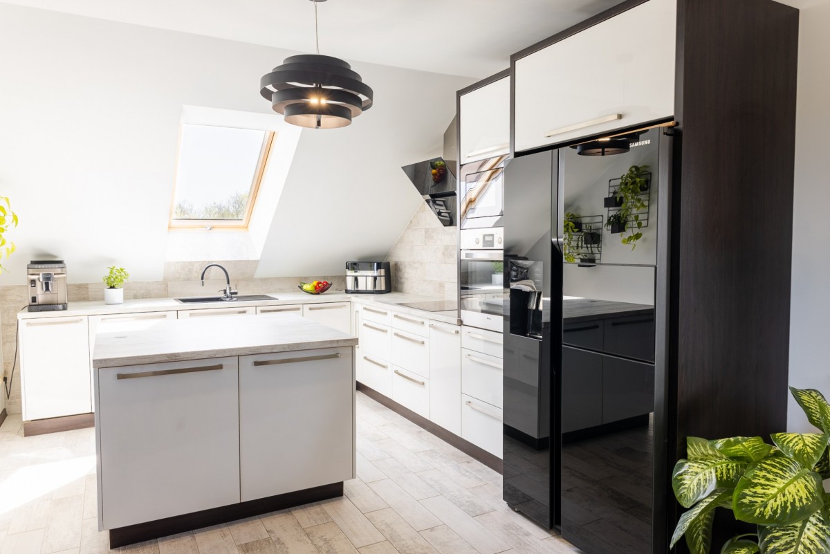 otwarta kuchnia - wyspa, pełna zabudowa meblowa i wyposażenie AGD
