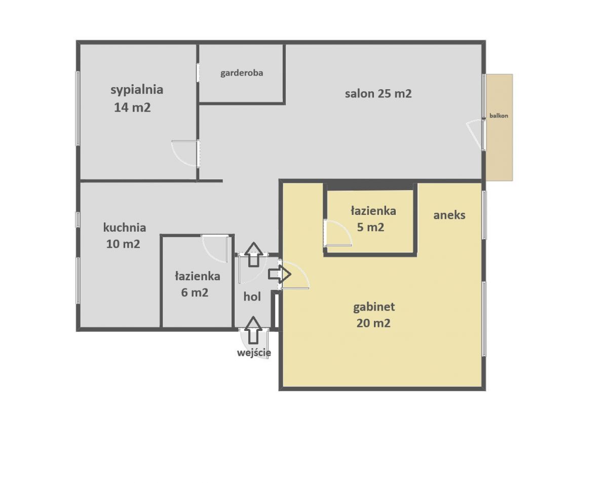 Aktualny układ to mieszkanie, które jest podzielone na salon, oddzielna kuchnię z oknem, sypialnia z garderobą, pokój z aneksem kuchennym, dwie łazienki oraz balkon..
