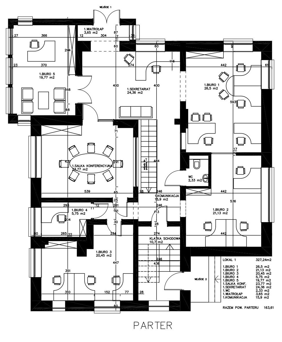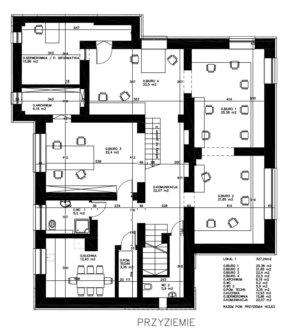 Do dyspozycji firmy - najemcy powierzchnia biurowa podzielona na 10 oddzielnych pomieszczeń pracy w tym sekretariat/recepcję oraz dwa oddzielne węzły sanitarne, serwerownię, dwa pomieszczenia techniczne/gospodarcze oraz spore zaplecze kuchenno/socjalne.