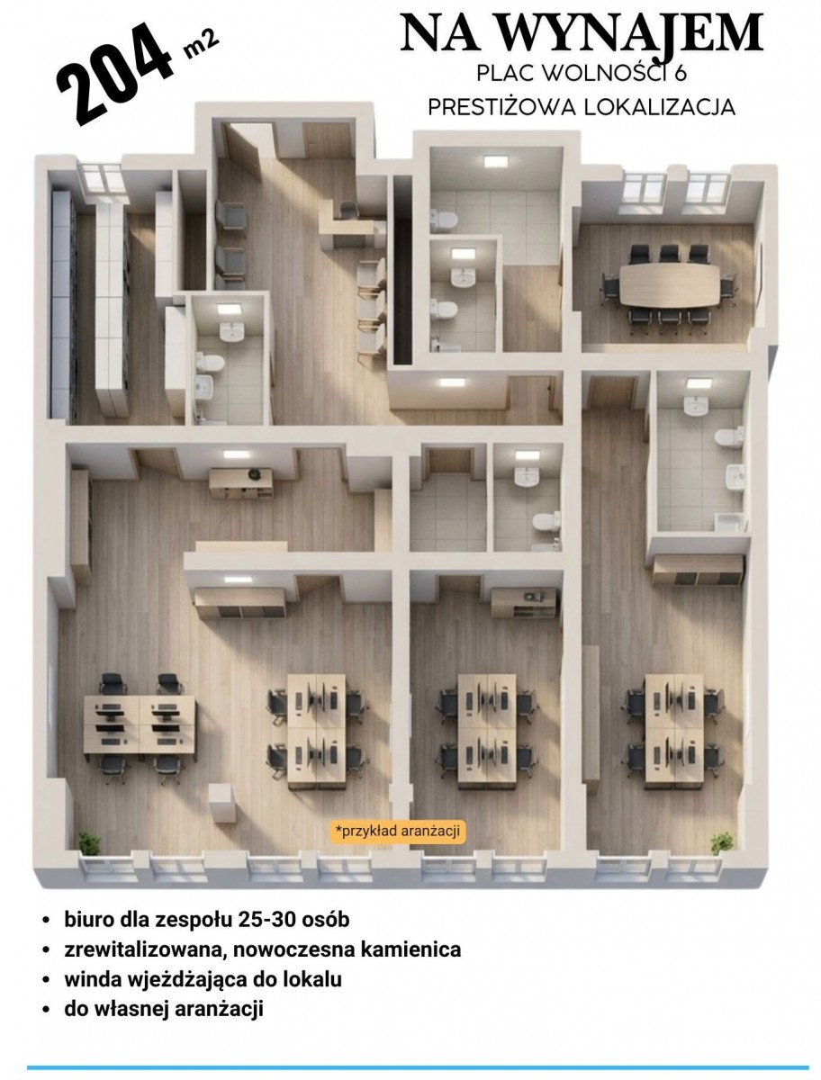 Do wynajęcia przestronna powierzchnia biurowa o powierzchni 204 m², zlokalizowana w reprezentacyjnej, zrewitalizowanej kamienicy z widokiem na Plac Wolności Poznaniu. Możliwość zrealizowania przestrzeni open space lub mniejszych pomieszczeń biurowych. To komfortowa przestrzeń dla zespołu 25-30 osób.
