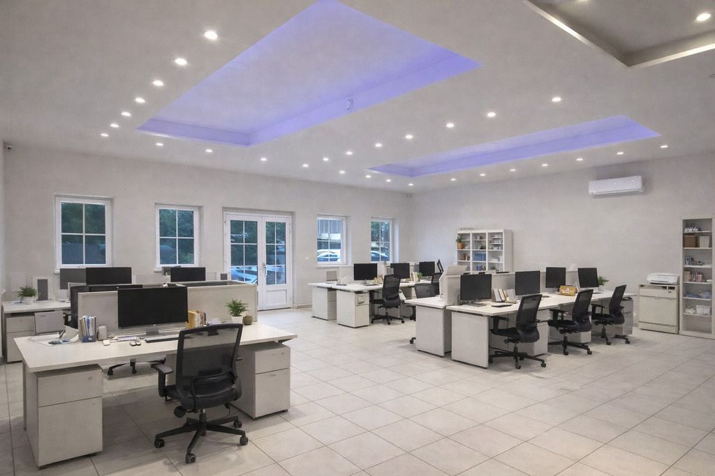 Istnieje jednak możliwość postawienia ścianek działowych. Dzięki temu z łatwością wyodrębnimy osobne pomieszczenia np. do pracy biurowej lub np. na gabinety medyczne czy salki szkoleniowe/lekcyjne.