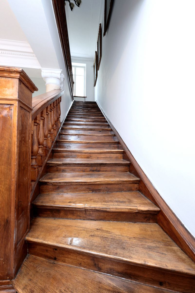 Zabytkowa klatka schodowa łącząca parter, piętro i poddasze