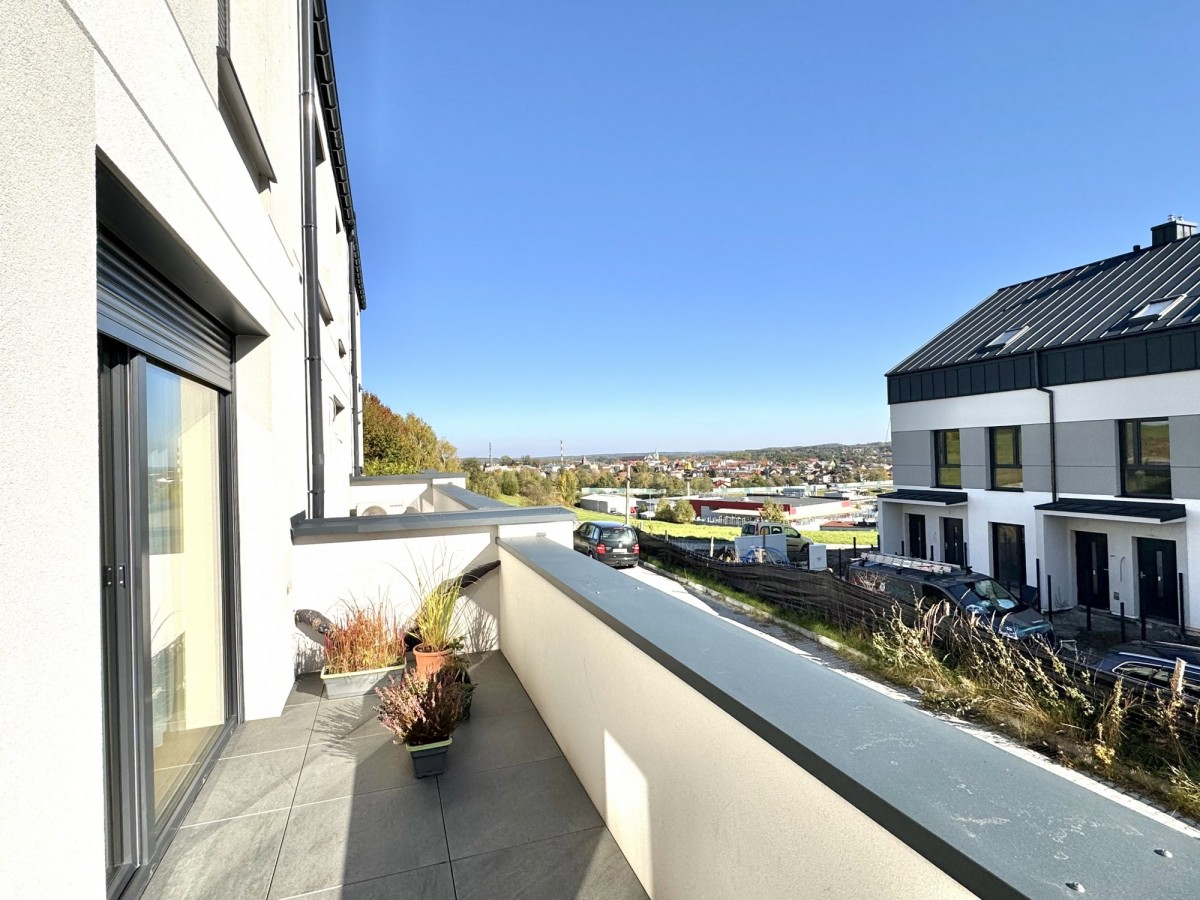 Widokowy balkon idealny na poranną kawę z panoramą Brzeska i wzgórza Okocim.