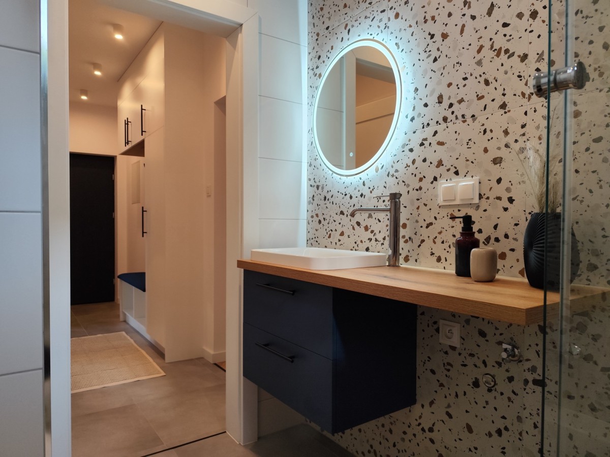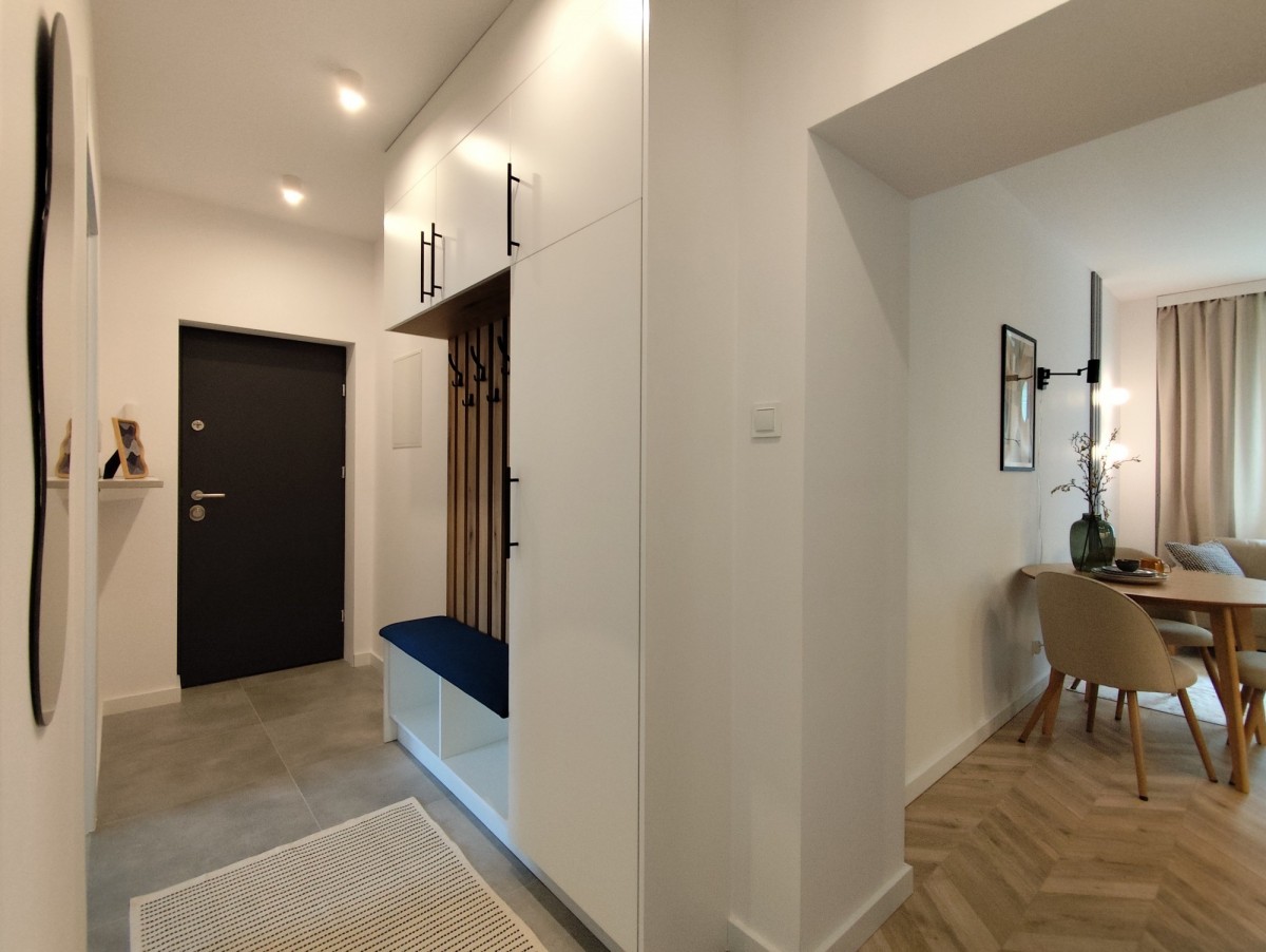 - przedpokój z praktycznym siedziskiem oraz szafkami na buty i środki czystości