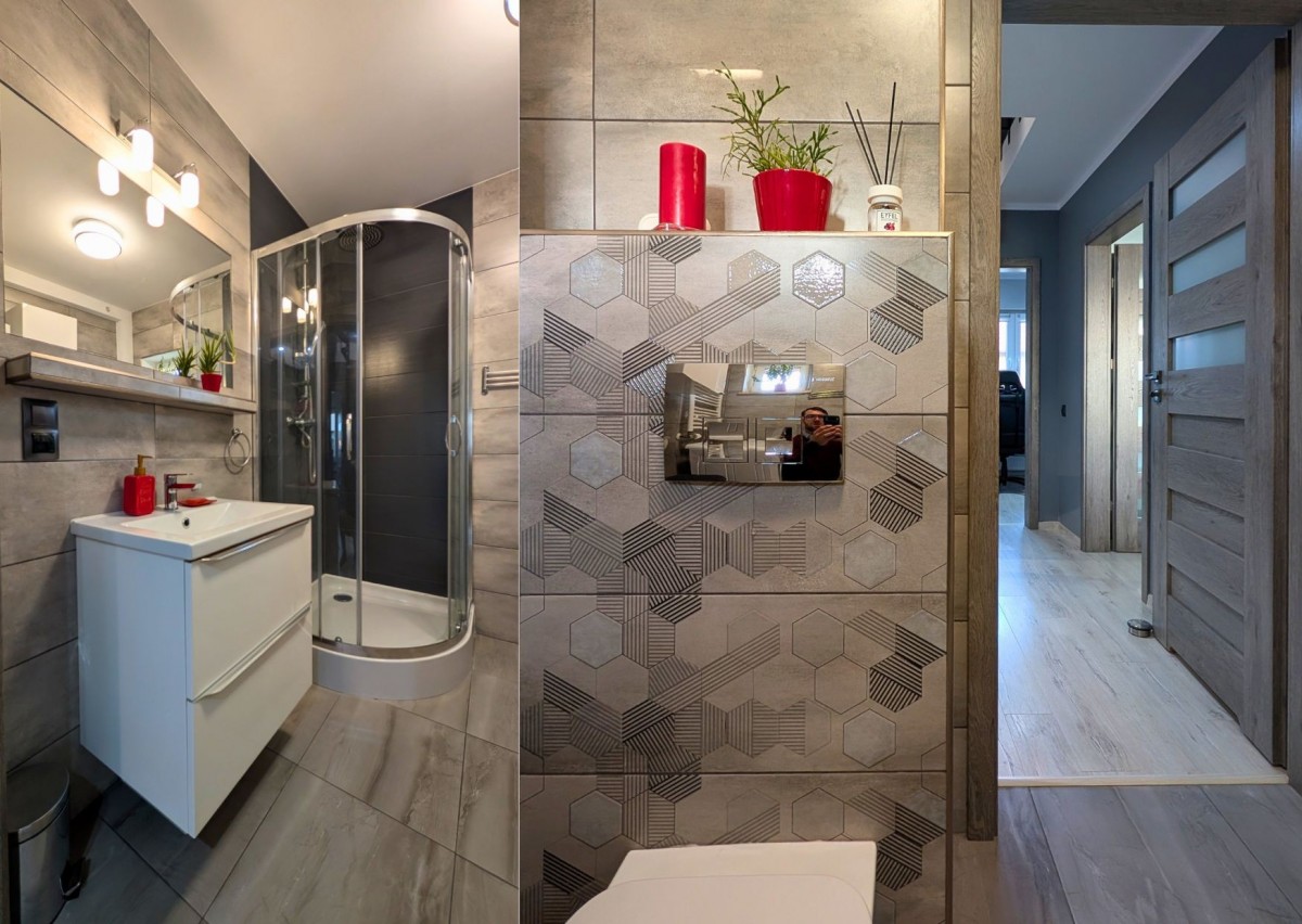 Nowoczesna łazienka (ok. 3,92 m2) z kabiną prysznicową.