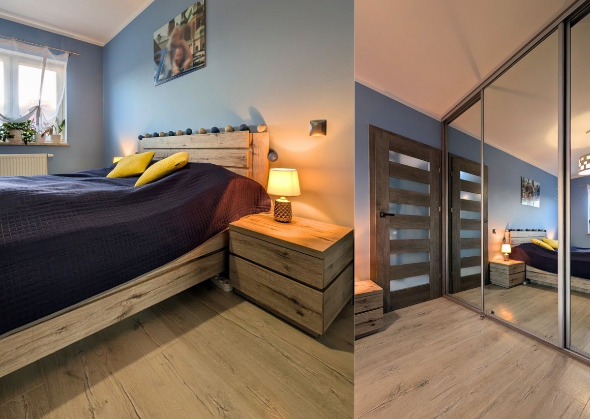 Dodatkowa przestrzeń pod skosami (ok. 8,3 m2) - całkowicie zabudowana szafami, tworząca potężną strefę przechowywania.