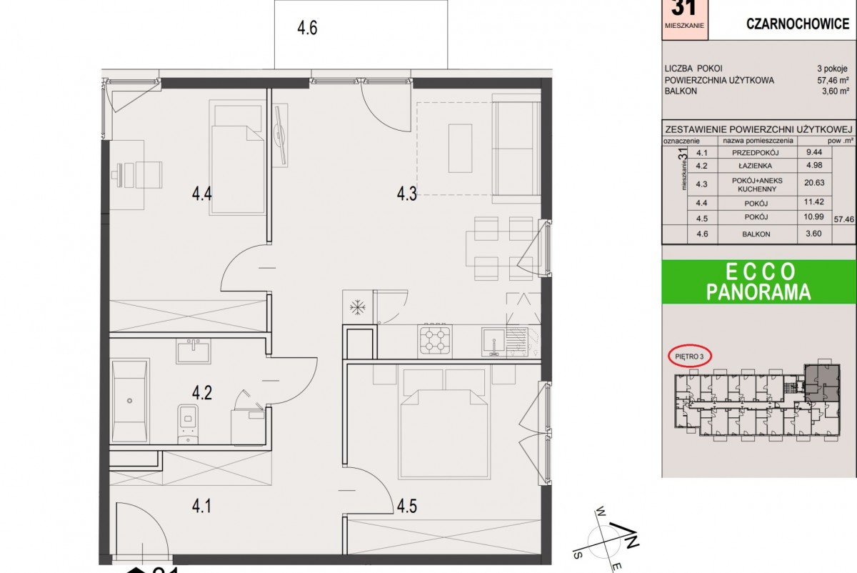 - Bezpośrednie wyjście na balkon z salonu 3,60 m2