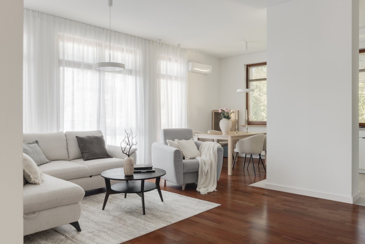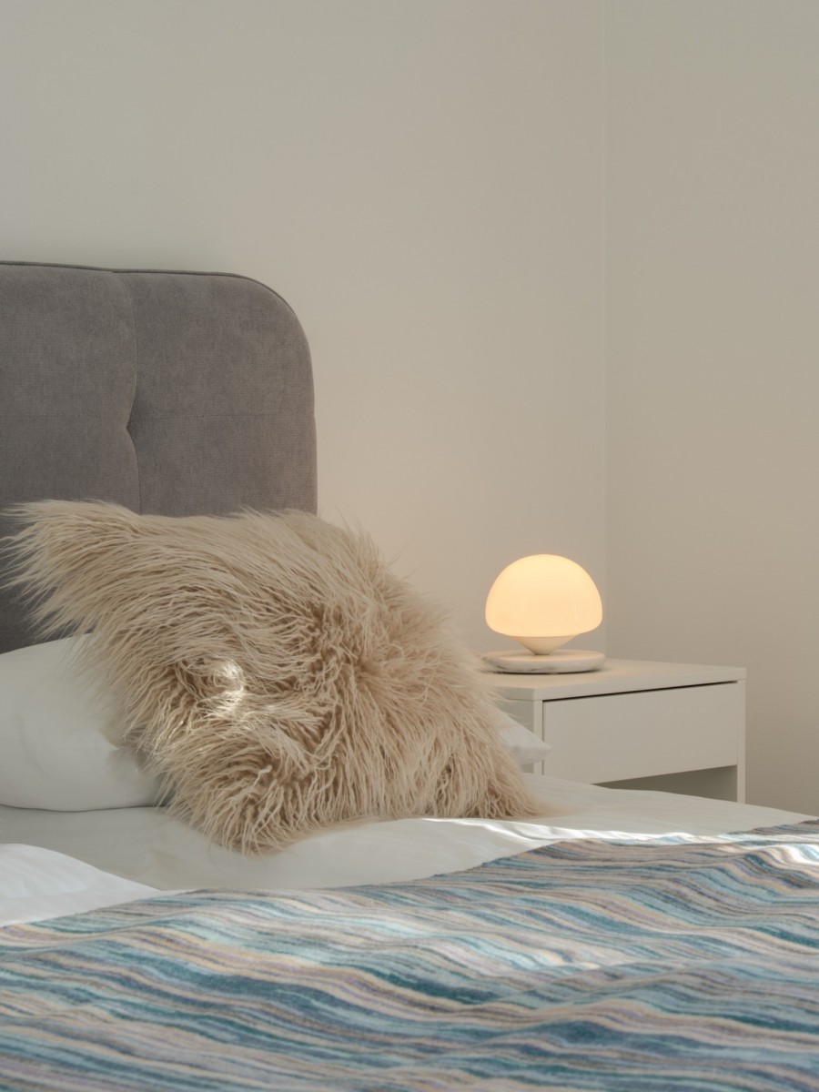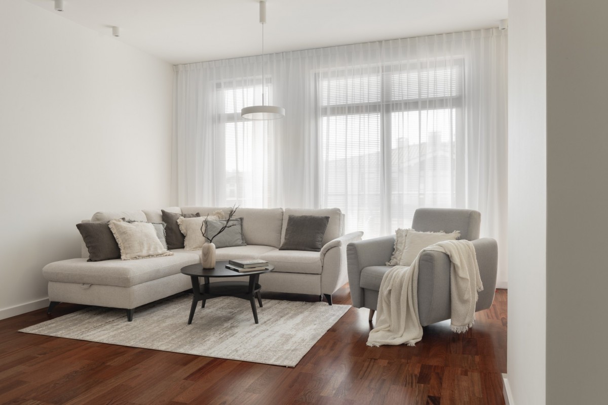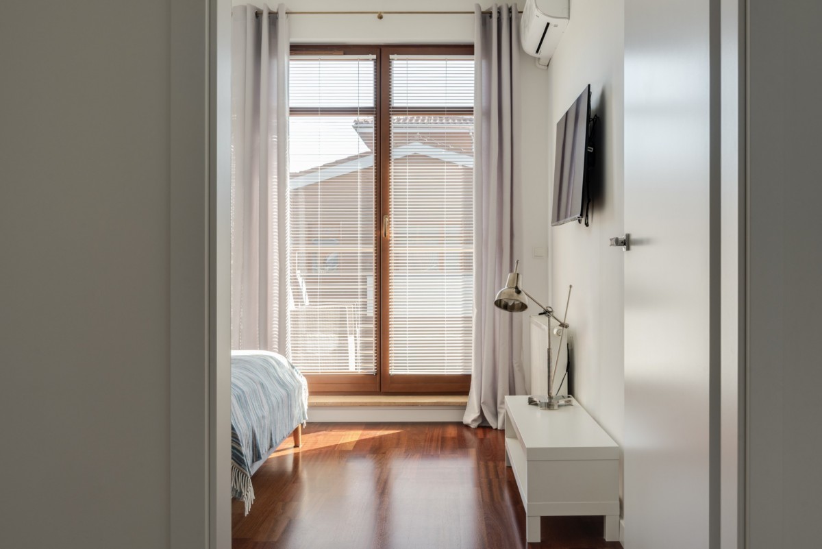 Podłoga w strefie sypialnianej i dziennej wykonana została z drewnianego parkietu. Apartament wyposażony w wiele funkcjonalnych rozwiązań dla zachowania maksymalnej przestrzeni i komfortu w codziennym użytkowaniu.