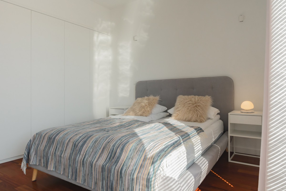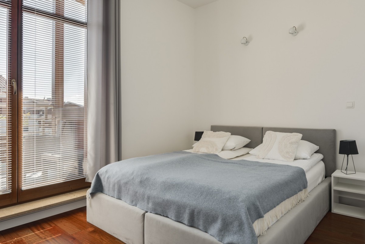 The floor in the bedroom and living area was made of wooden parquet. The apartment is equipped with many functional solutions for maximum space and comfort in daily use.