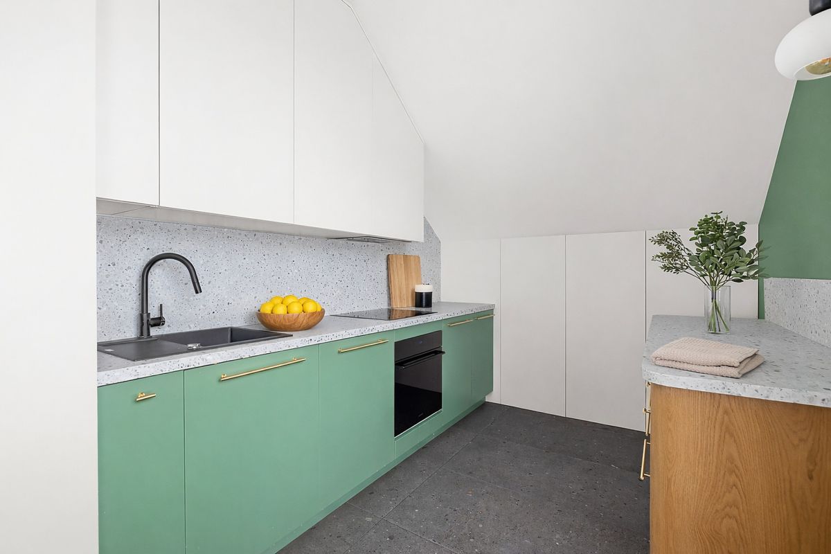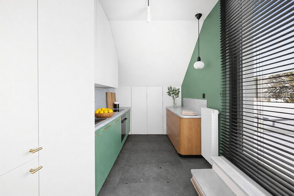 * wyraźnie wydzieloną kuchnią (ta sama, jasna ekspozycja jak w przypadku salonu),