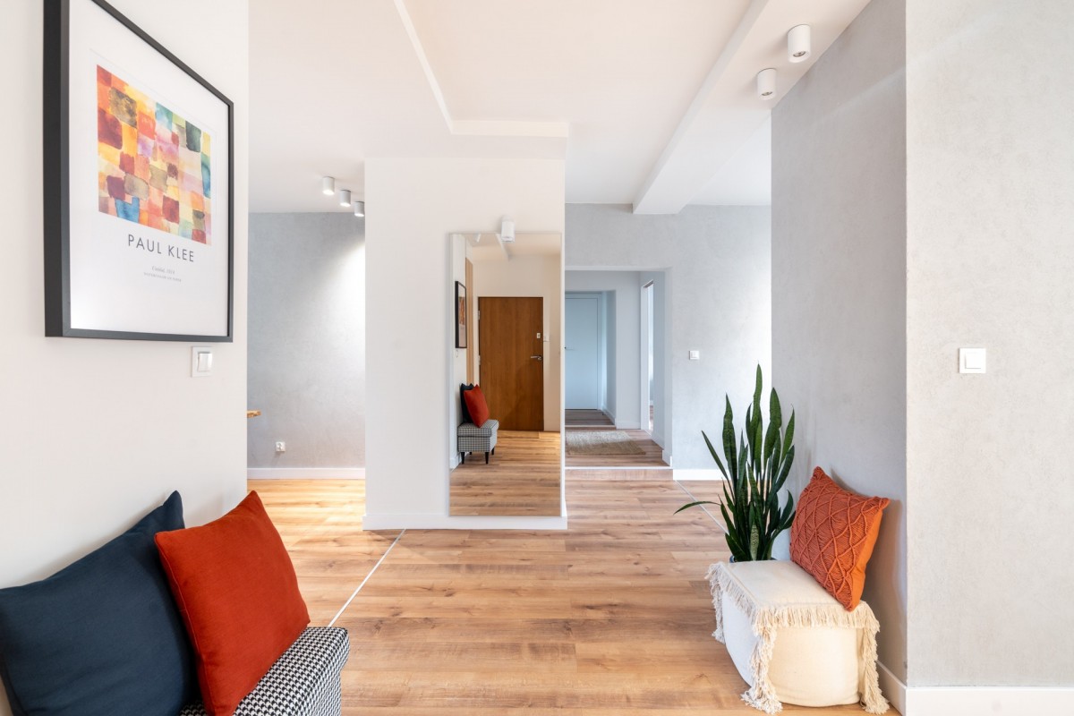 Funkcjonalnie lokal podzielony jest na strefę suchą i mokrą - od strony południowo-zachodniej znajdują się: salon oraz sypialnia, od północno-wschodniej - w strefie mokrej - znajduje się kuchnia i dwie łazienki. Dzięki otwarciu na dwie strony zapewniona jest odpowiednia cyrkulacja powietrza. Dodatkowym atutem sypialni jest bliska lokalizacja łazienki oraz wydzielona przestrzeń na garderobę dostępna bezpośrednio z pokoju sypialnego. Klimatyzatory w salonie i sypialni sprawiają, że lokacja od południa czyni ze strefy wypoczynku komfortową nawet podczas największych upałów.