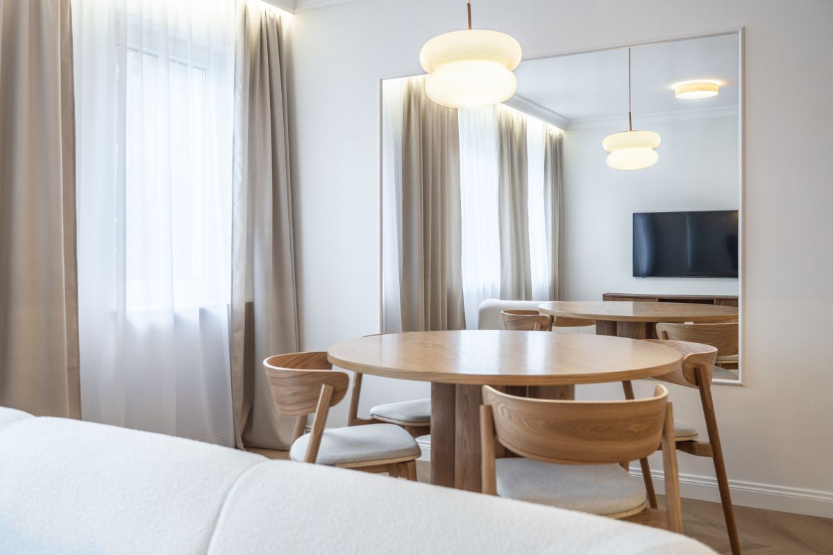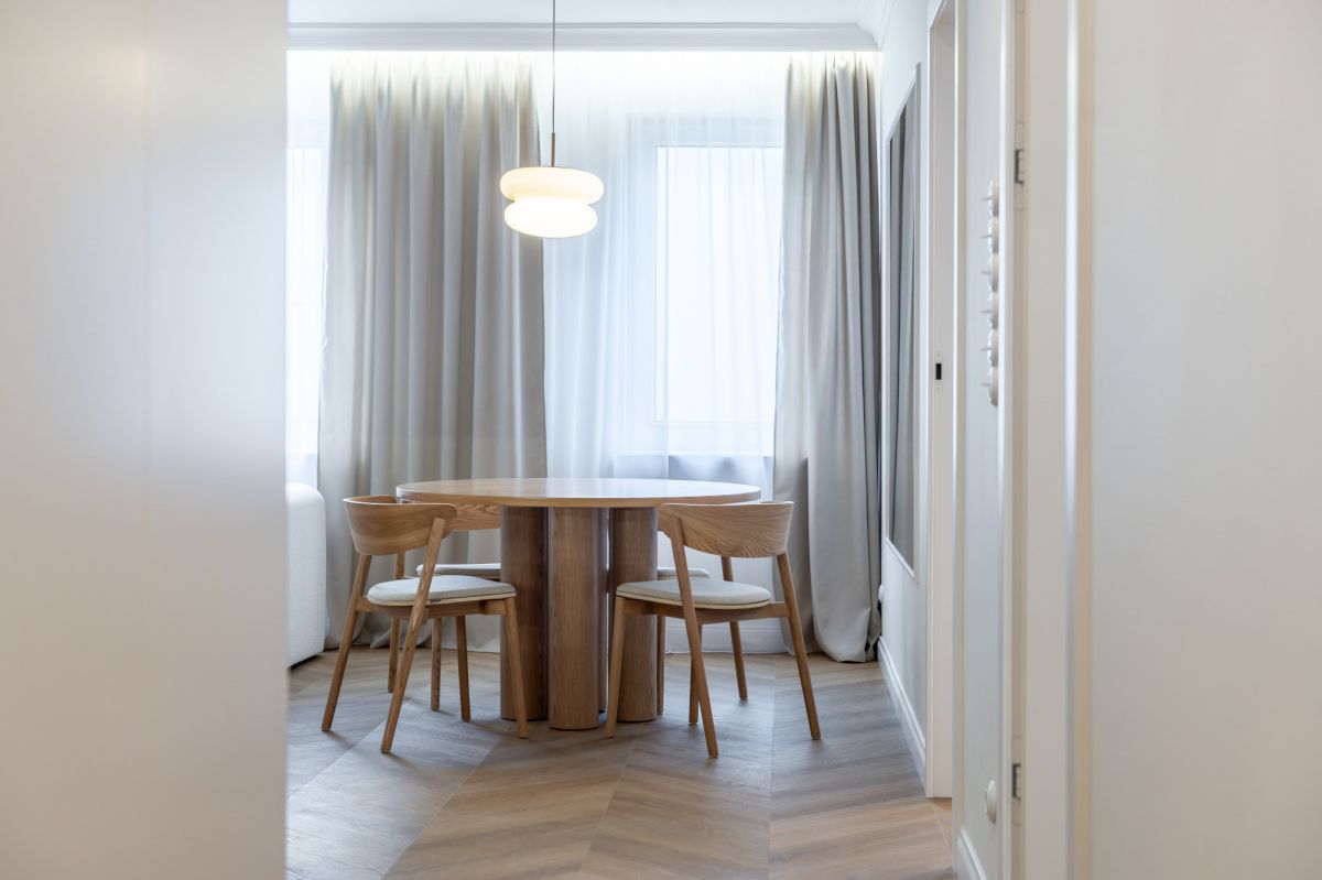 * strefę jadalnianą z drewnianym stołem i krzesłami renomowanych polskich producentów, tworzącą atmosferę przytulnego luksusu,
