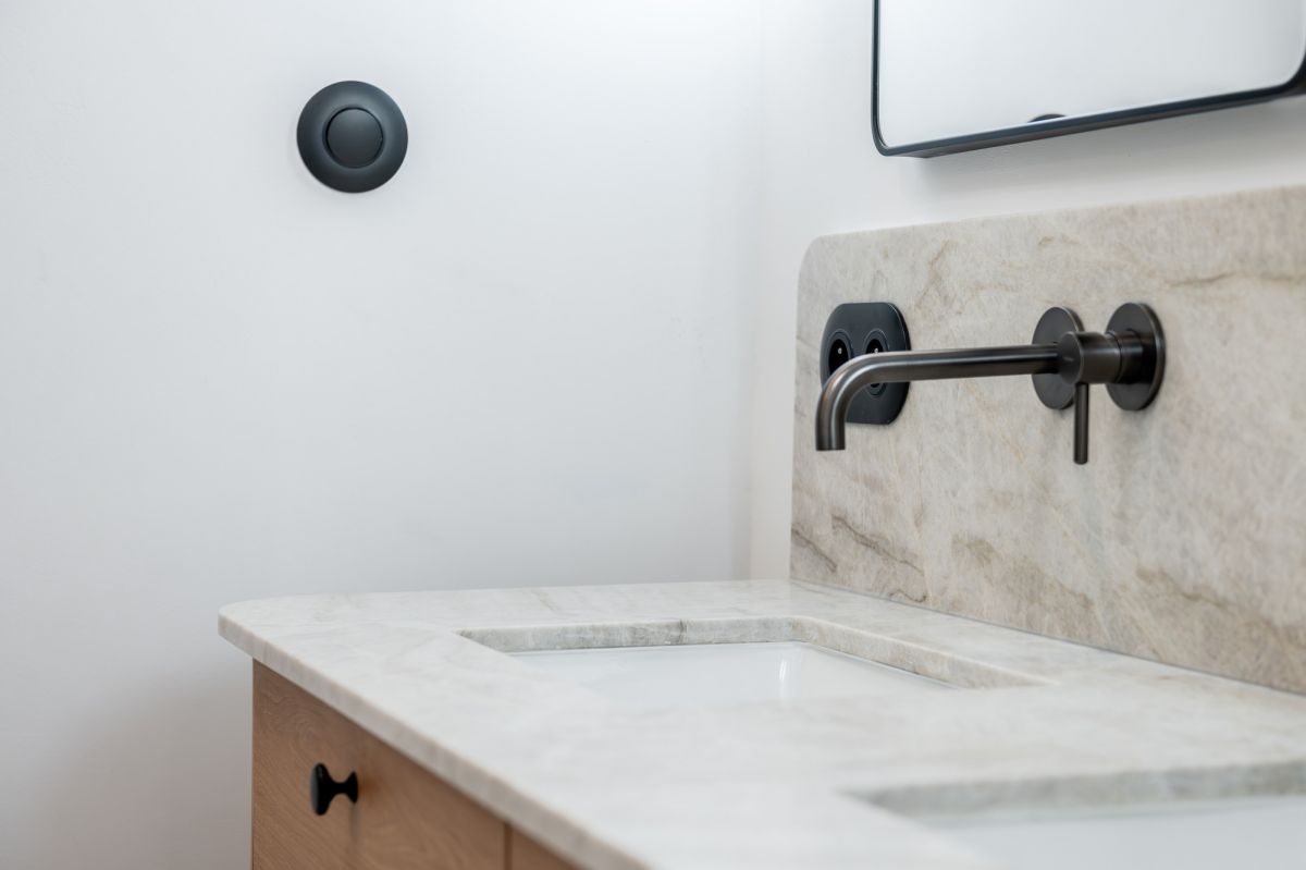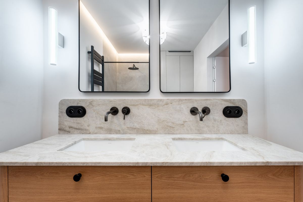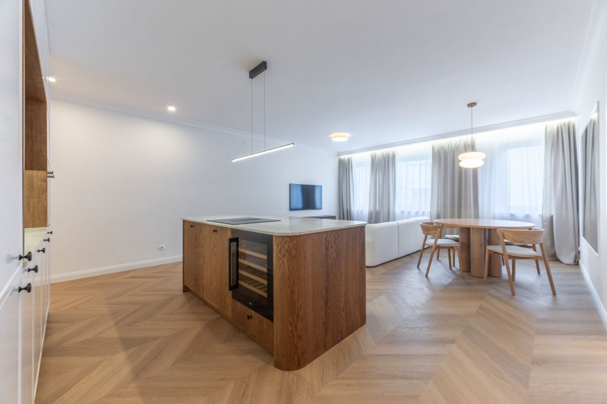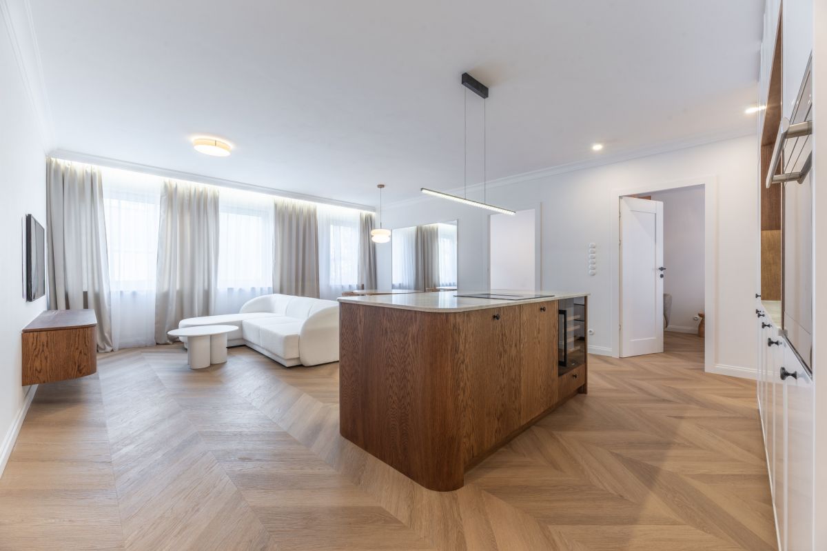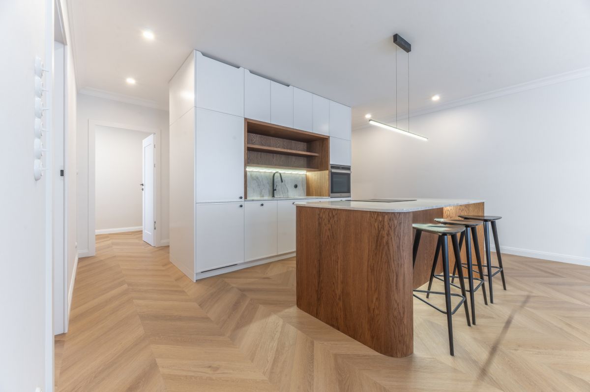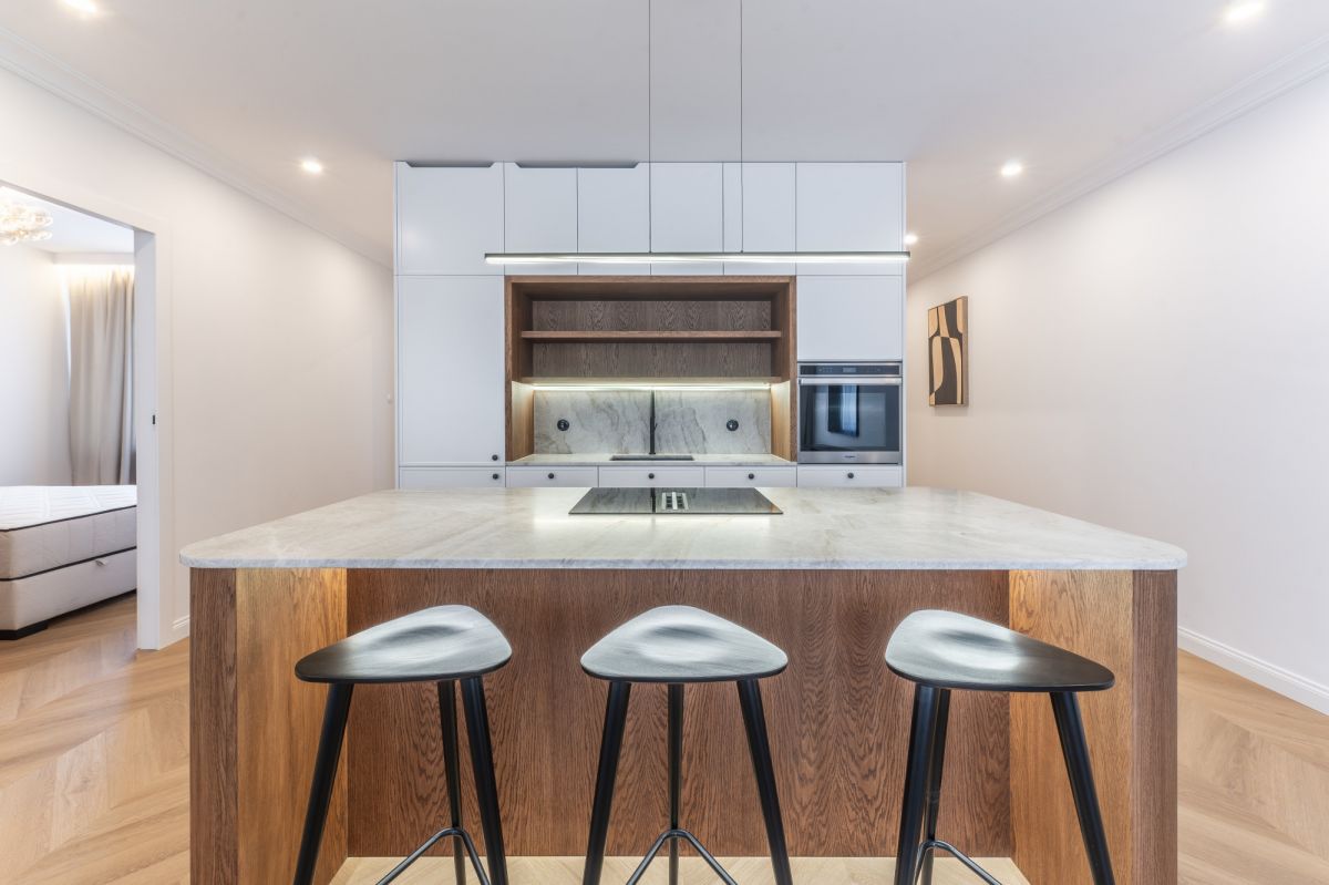 * kuchnię w zabudowie wykonaną z najwyższej jakości forniru i malowanego MDF, utrzymaną w minimalistycznej, ponadczasowej stylistyce,