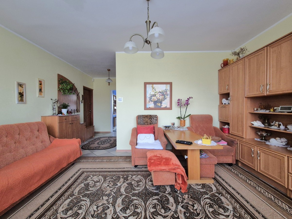 * salon wyposażony w rozkładaną kanapę, fotele i meblościanę