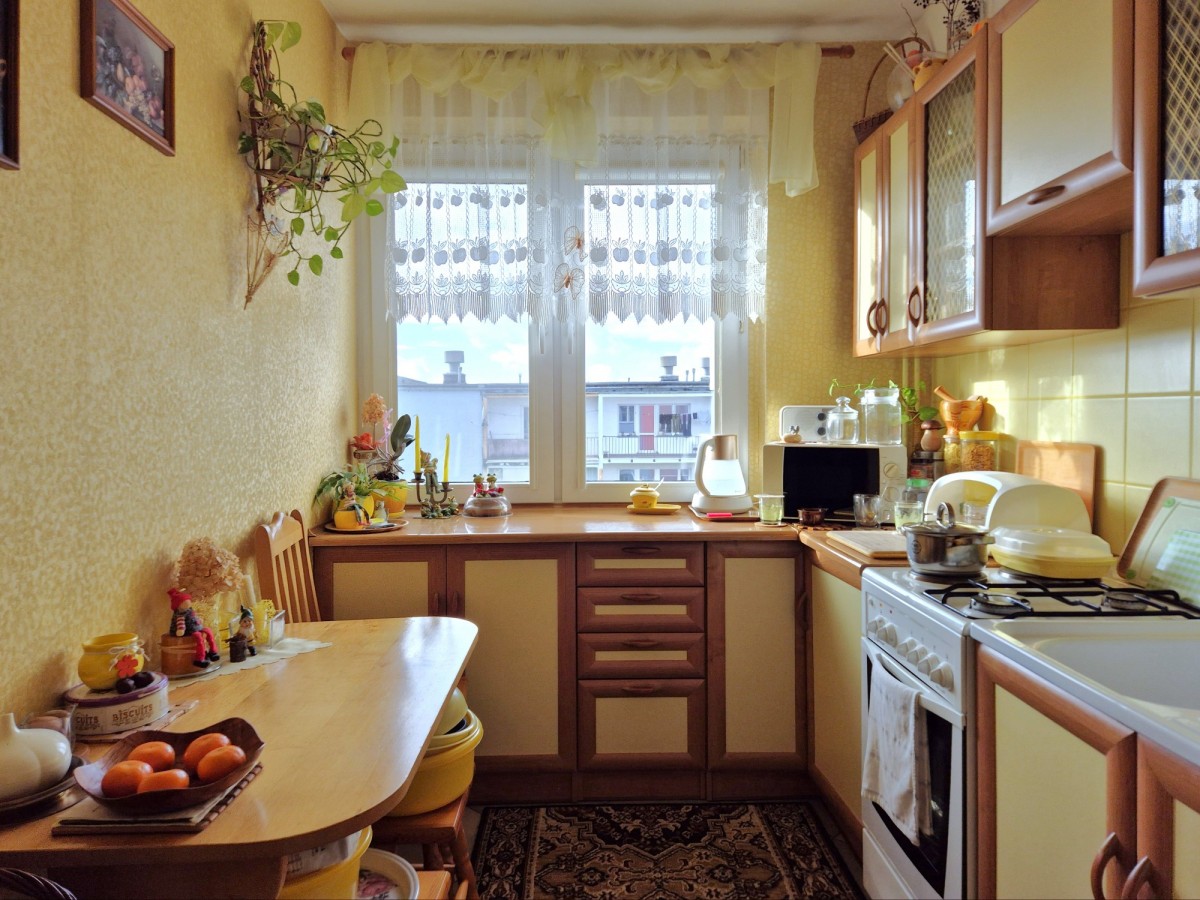 * widna kuchnia wyposażona w meble kuchenne, lodówkę, zlewozmywak oraz kuchenkę gazową z piekarnikiem, dodatkowo filtr wody wbudowany