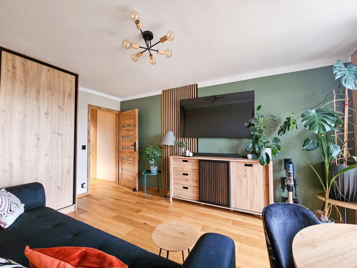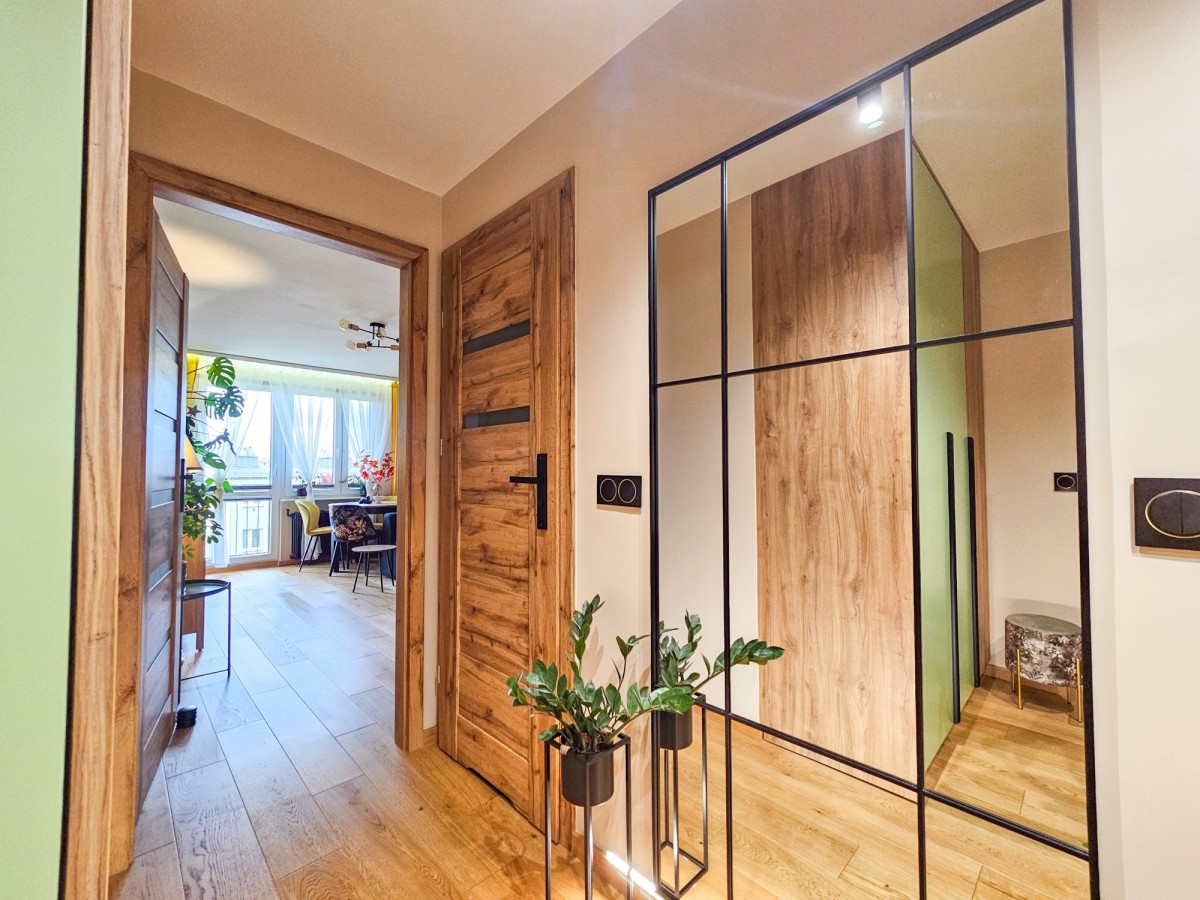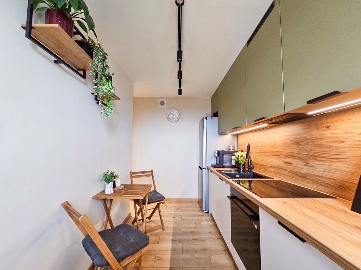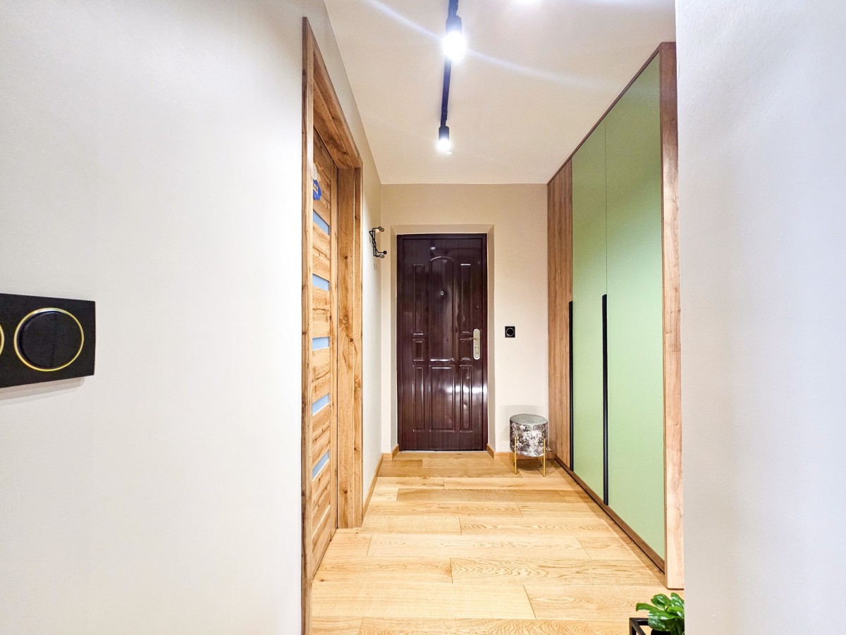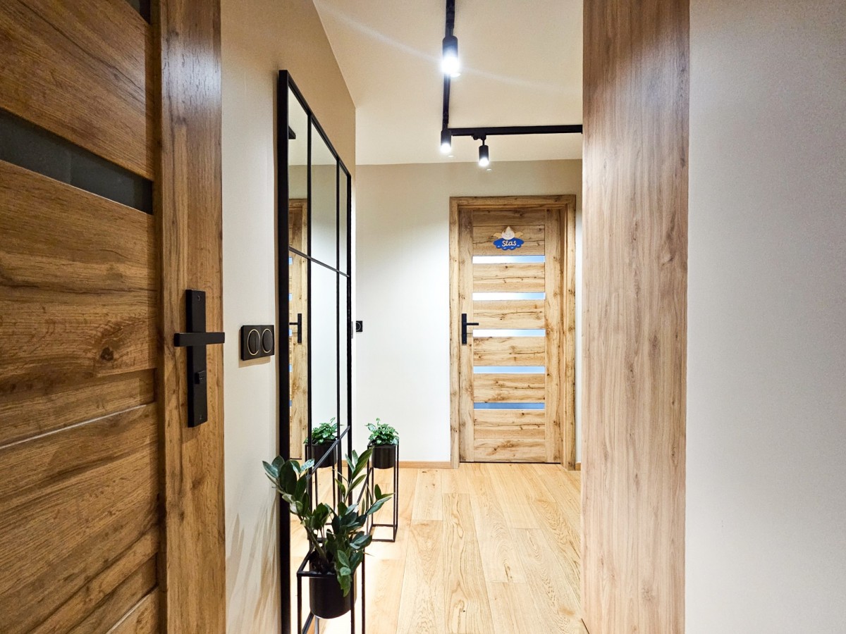 Mieszkanie wykończone z dbałością o każdy detal - drewniane podłogi, nowoczesne, przemyślane oświetlenie oraz meble w zabudowie, które gwarantują maksymalne wykorzystanie przestrzeni i elegancki wygląd.