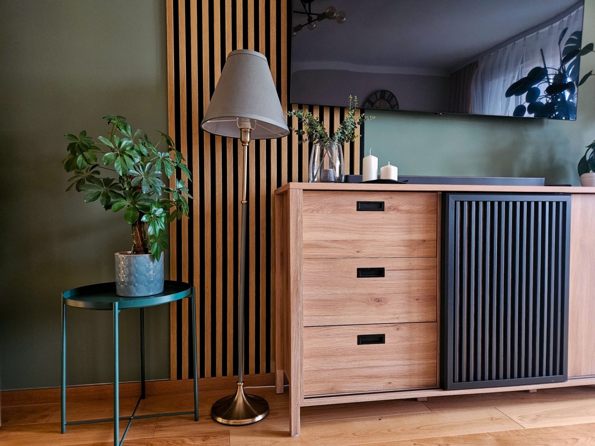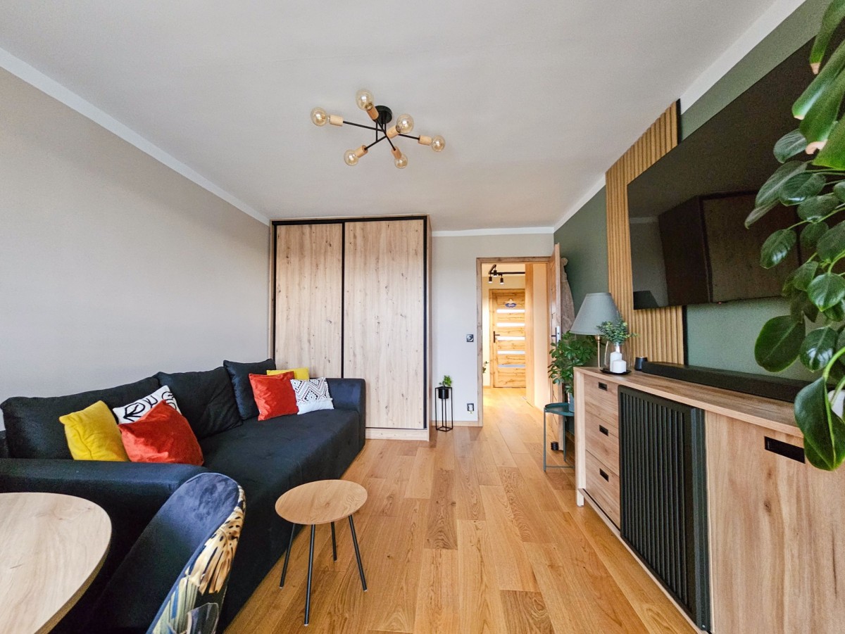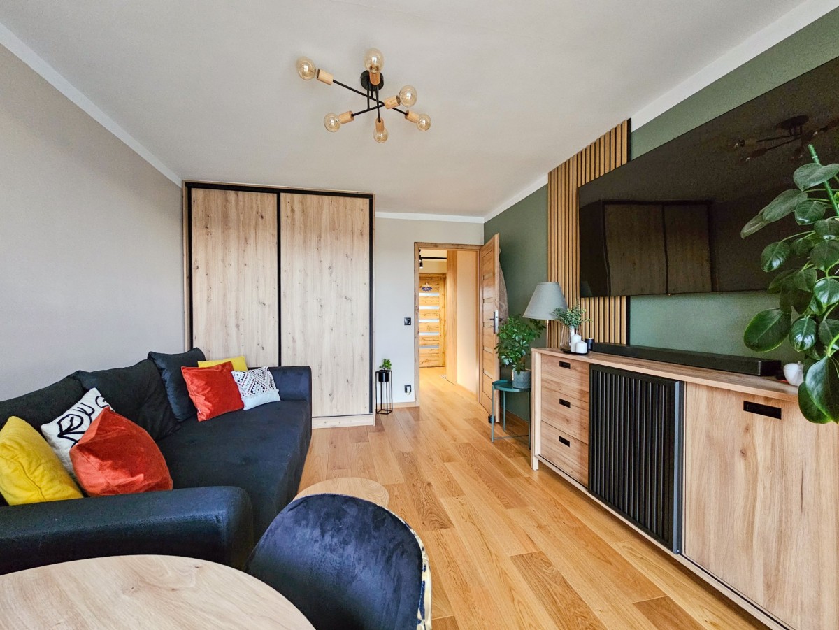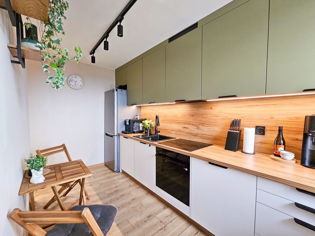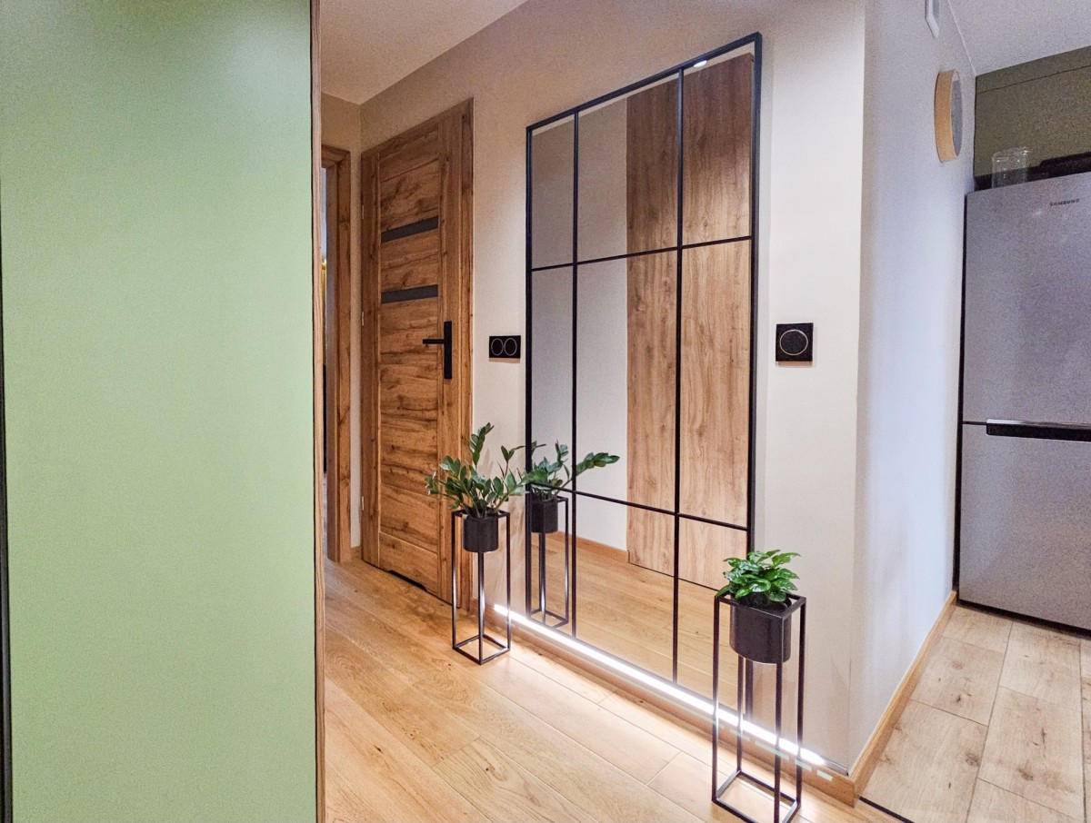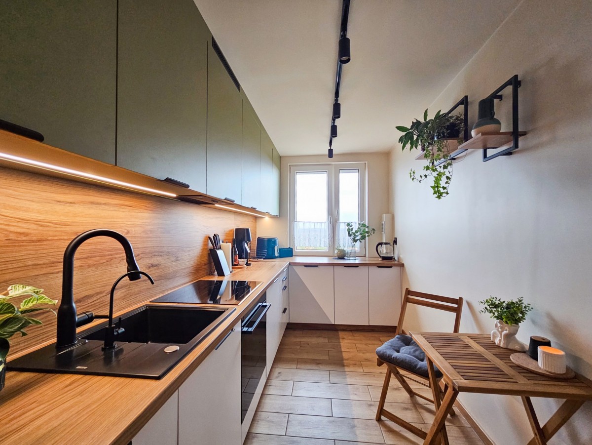 Mieszkanie wykończone z dbałością o każdy detal - drewniane podłogi, nowoczesne, przemyślane oświetlenie oraz meble w zabudowie, które gwarantują maksymalne wykorzystanie przestrzeni i elegancki wygląd.