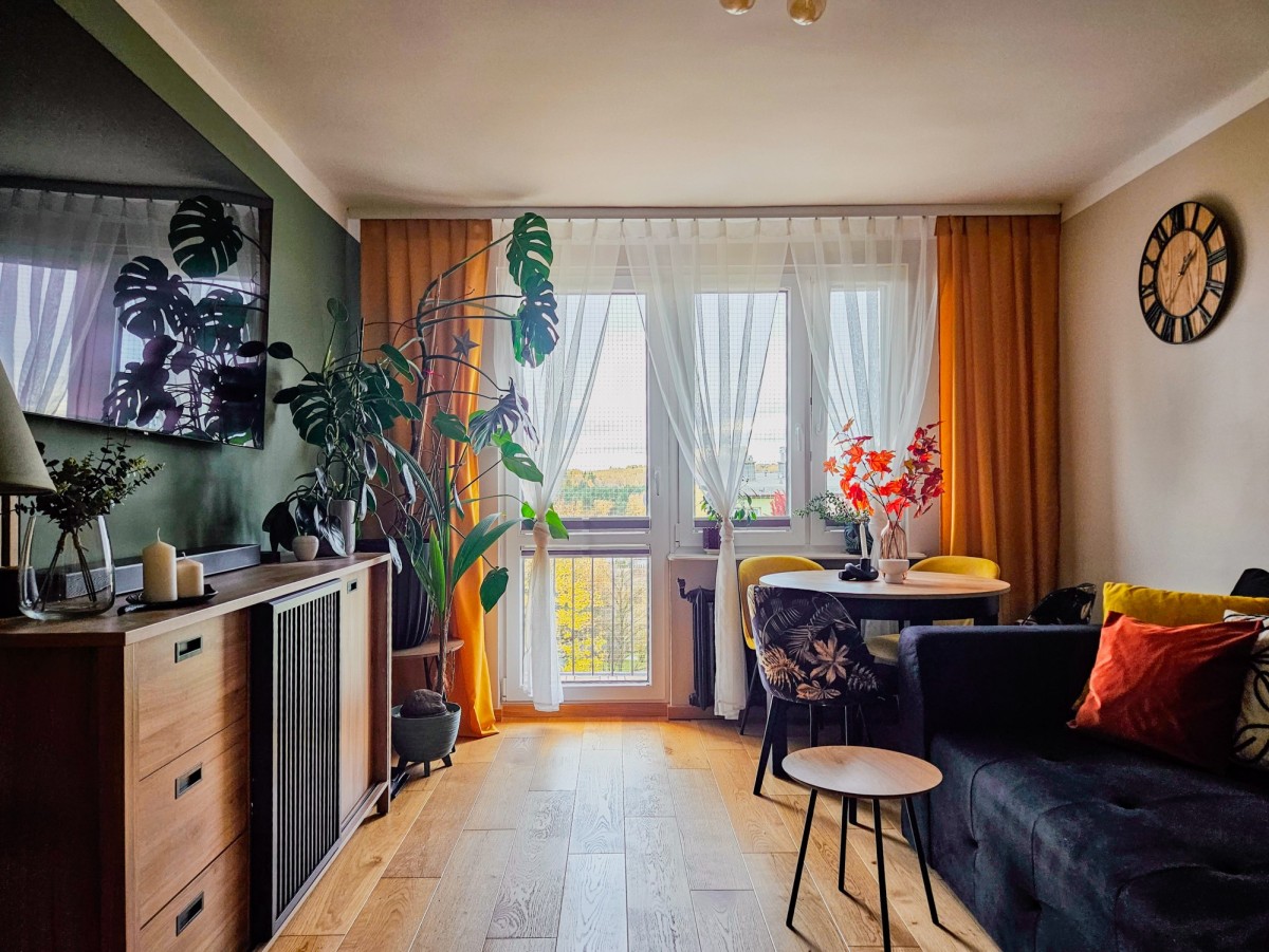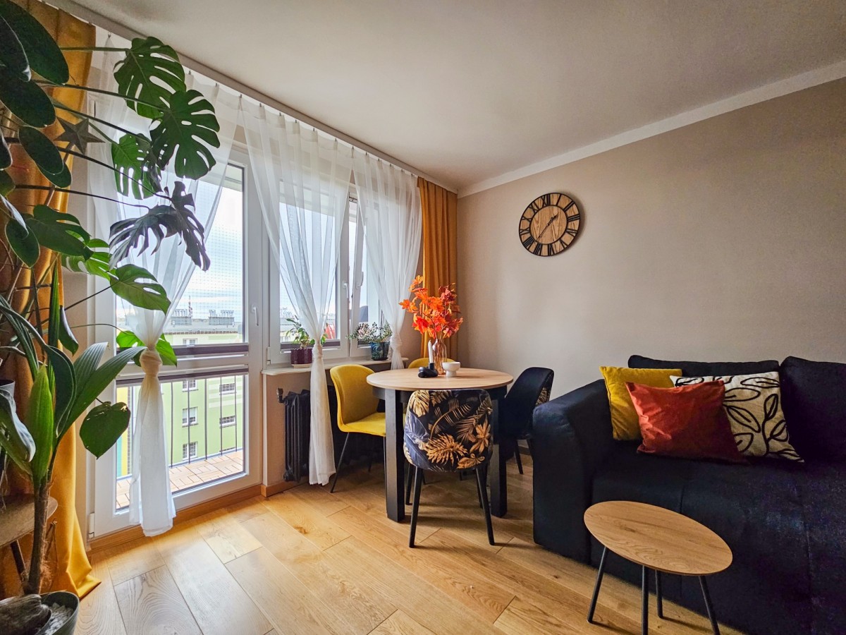 W salonie znajduje się wyjście na balkon, idealne miejsce na poranną kawę lub wieczorny odpoczynek.