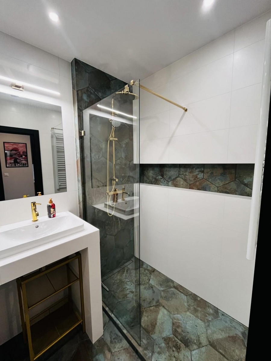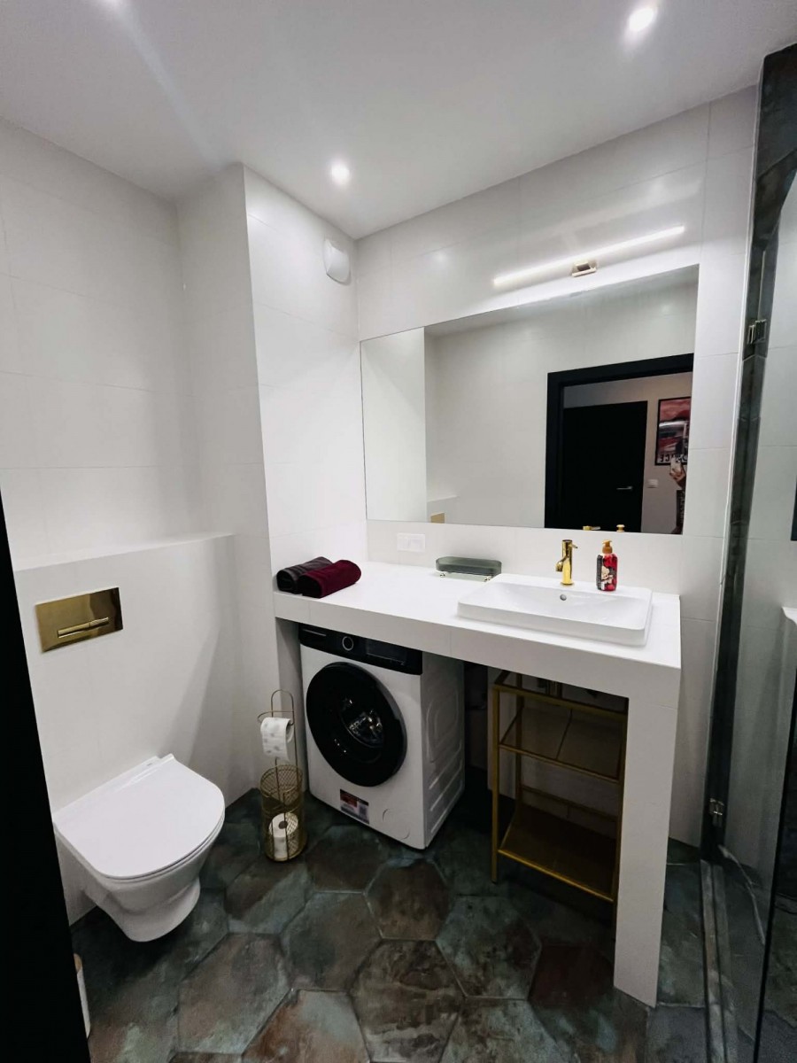 - Łazienka: Nowoczesny design, wysokiej klasy armatura, pralka.