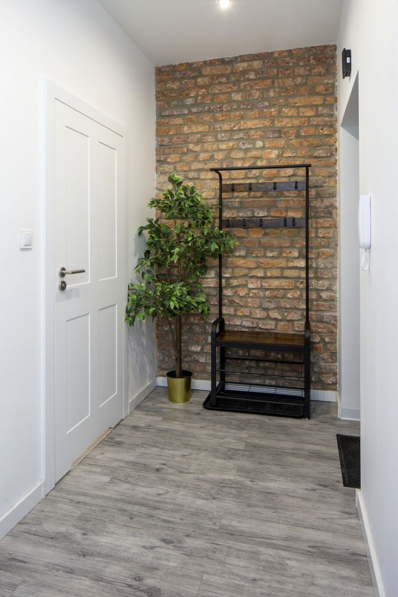 - na ścianach fragmenty odkrytej zabytkowej cegły