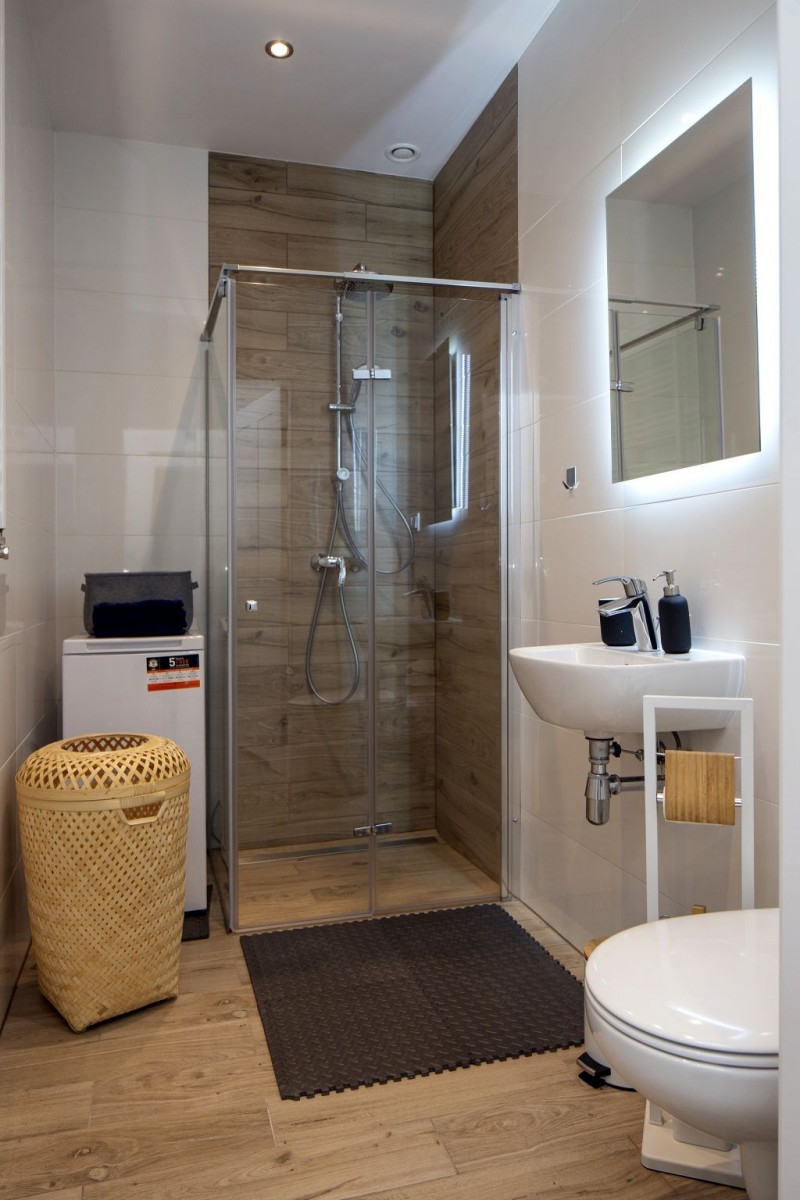 - łazienka wykończona: płytki (biały + drewno), umywalka i miska WC Grohe, bateria umywalkowa i prysznicowa z deszczownicą Grohe, kabina prysznicowa, pralka, odpływ liniowy, sufit podwieszony z oświetleniem