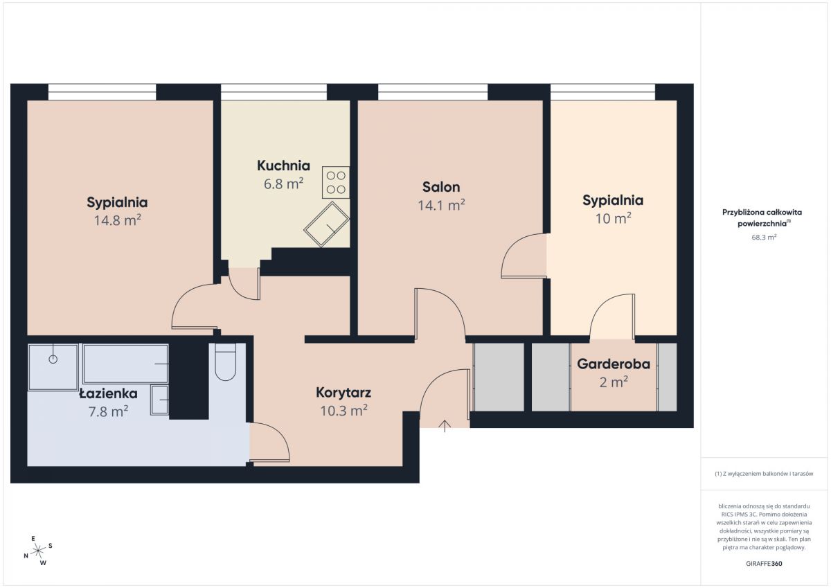 Mieszkanie o powierzchni ok. 68,5 m² składa się z: