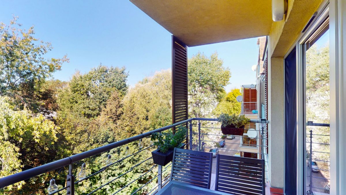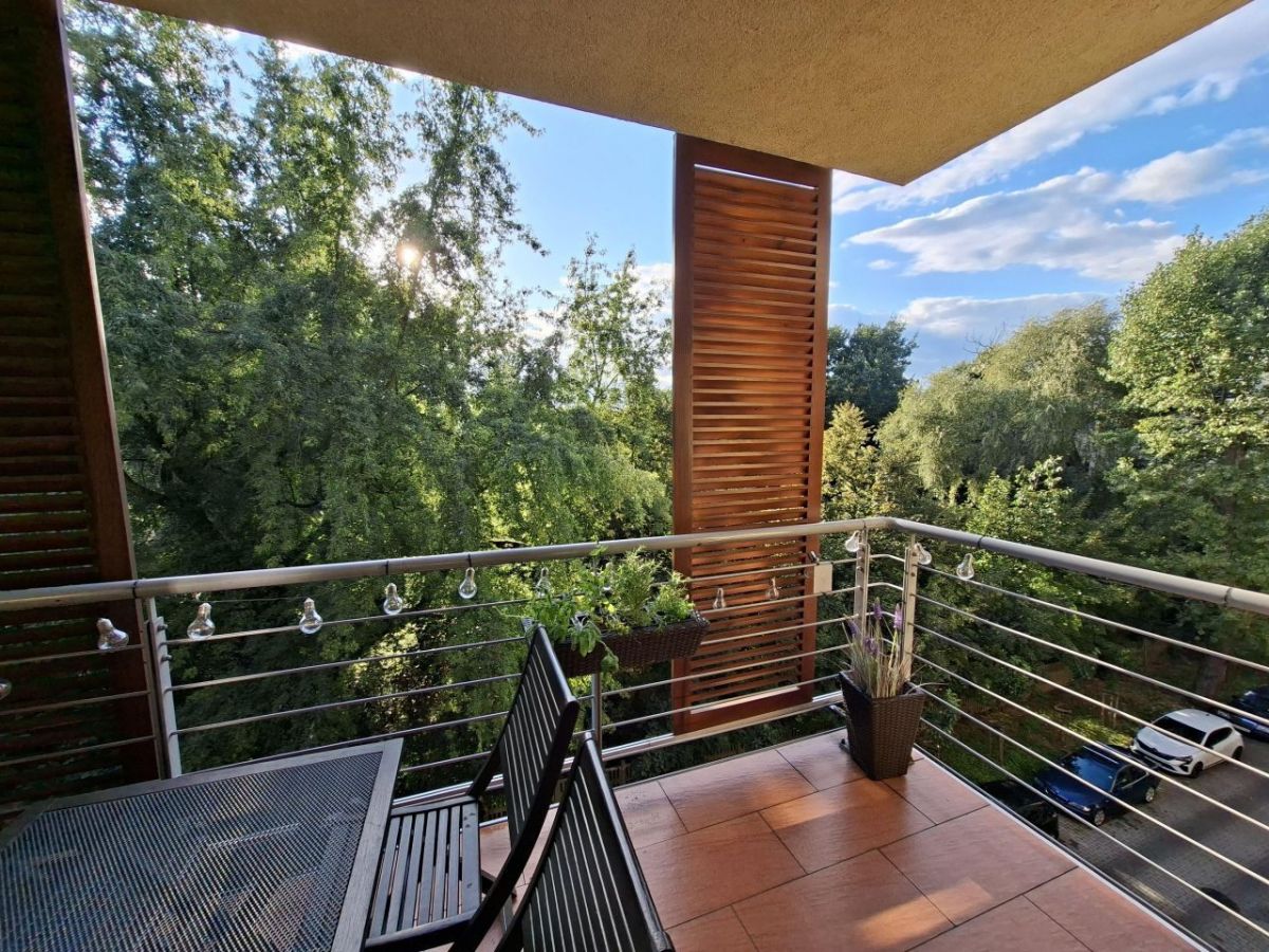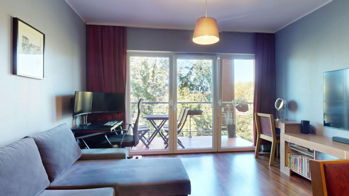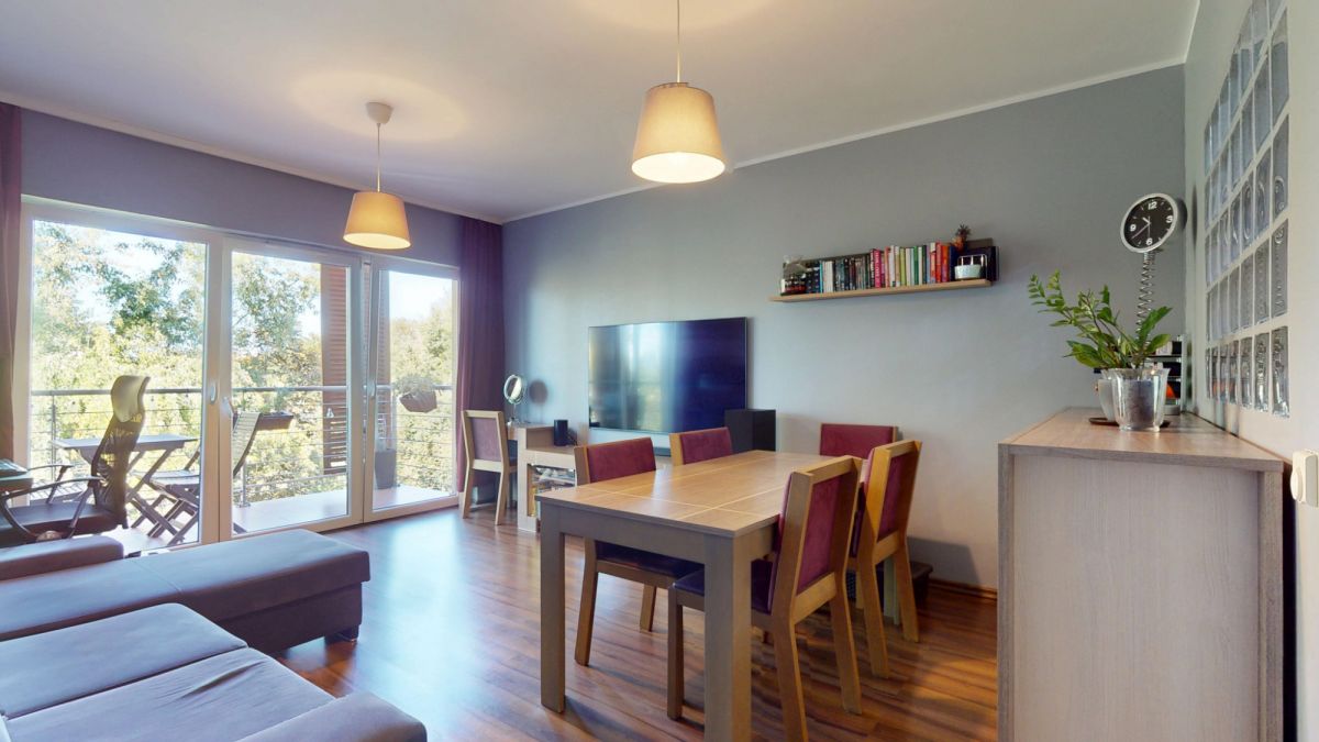 - przestronnego salonu z wyjściem na duży balkon od strony zachodniej z widokiem na zieleń, gdzie wieczorem z przyjemnością napijesz się ciepłej herbaty albo lampki wina i popatrzysz, jak słońce chowa się za drzewami,