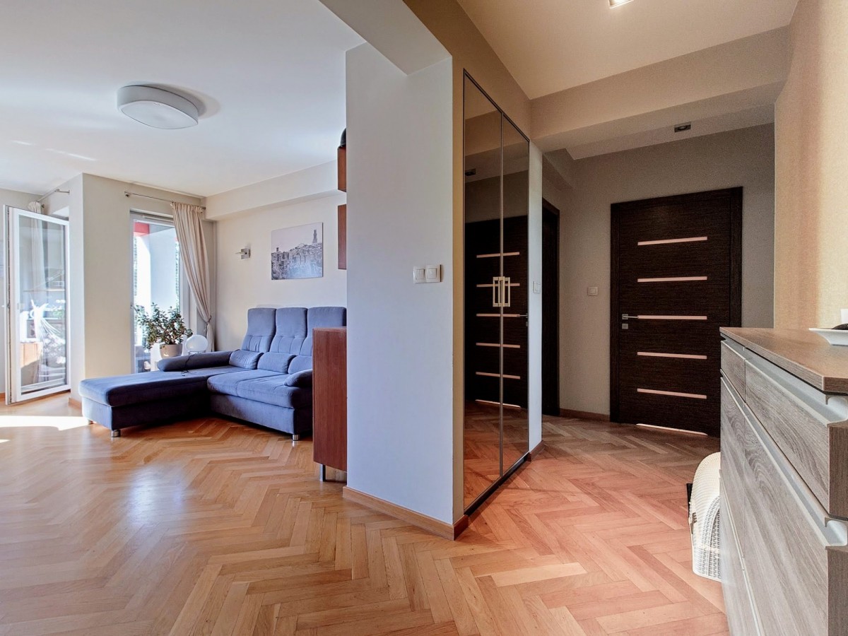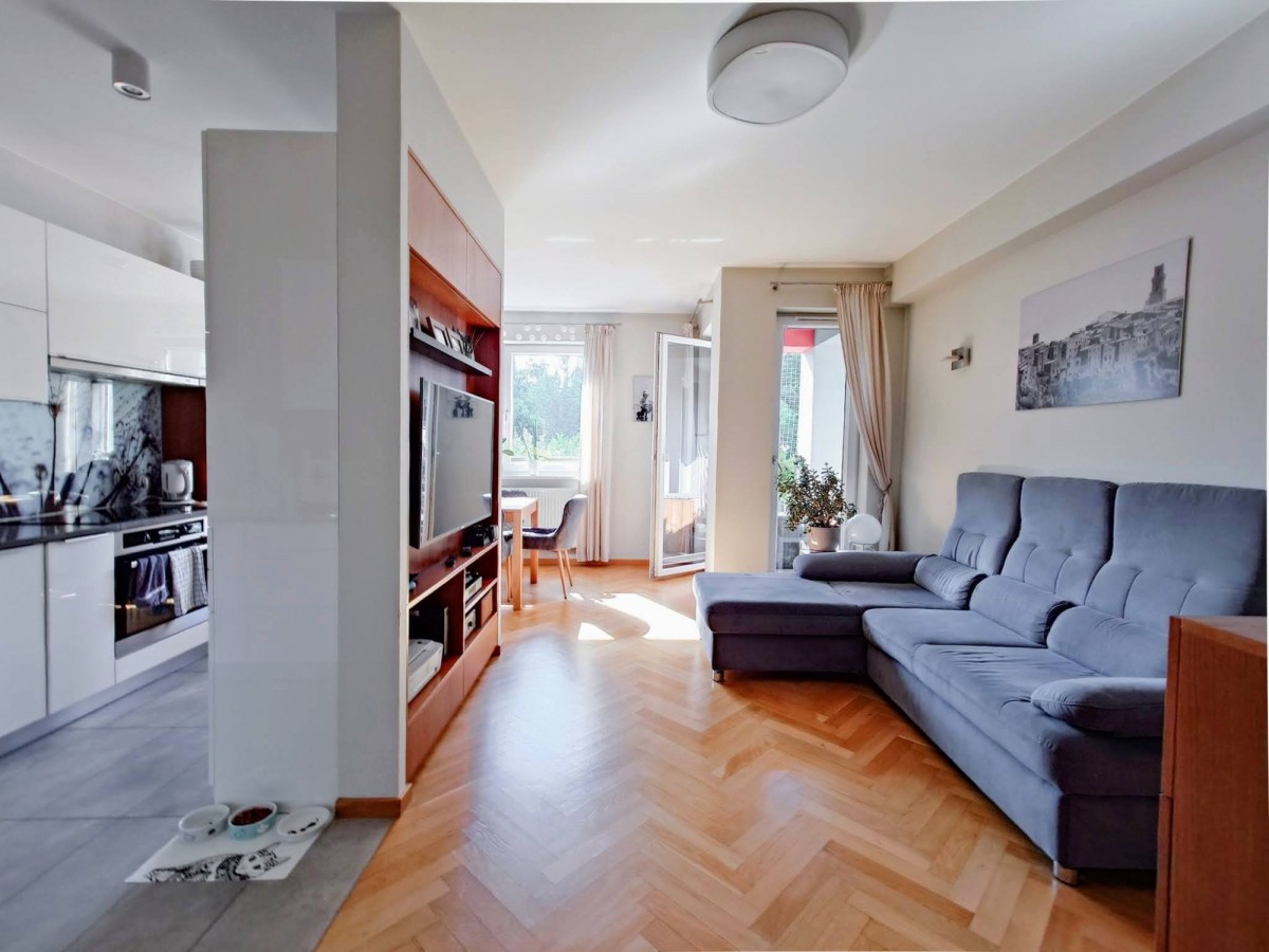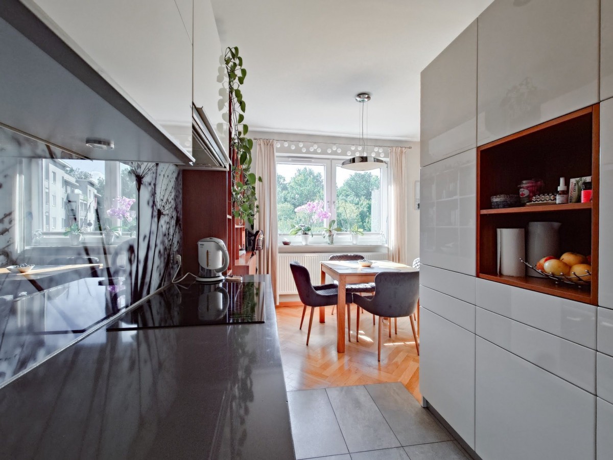 W pokojach parkiet w jodełkę, w aneksie kuchennym i łazience, płytki gresowe. Zabudowa kuchenna oraz szafy projektowane na wymiar. Wszystko w bardzo dobrym stanie, nie wymagającym napraw, czy poprawek. Loggia od południa z widokiem na zieleń i ogrodzony, prywatny plac zabaw.