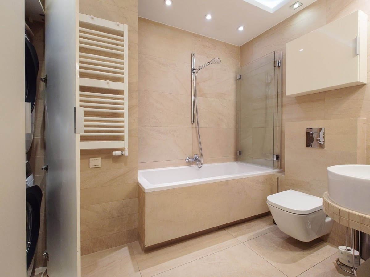 - łazienka z wanną oraz zabudową na pralkę i suszarkę.