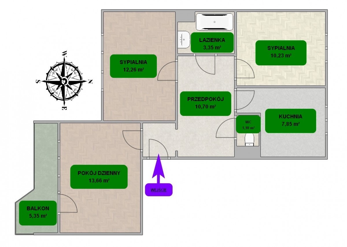 Pokoje: 3 osobne (13,66 m² | 12,26 m² | 10,23 m²)